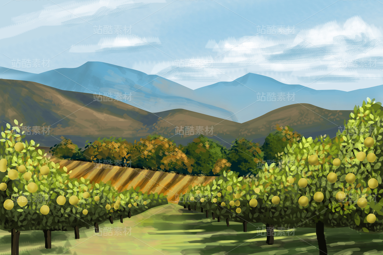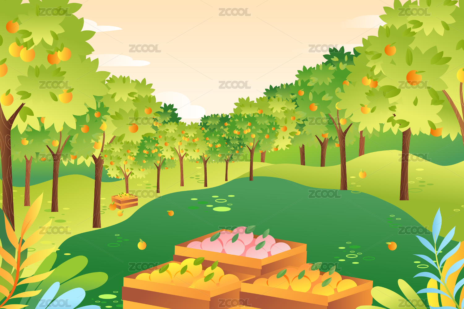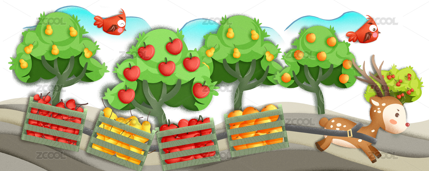 剪紙風(fēng)格可愛的馴鹿在果園收獲各種水果插畫