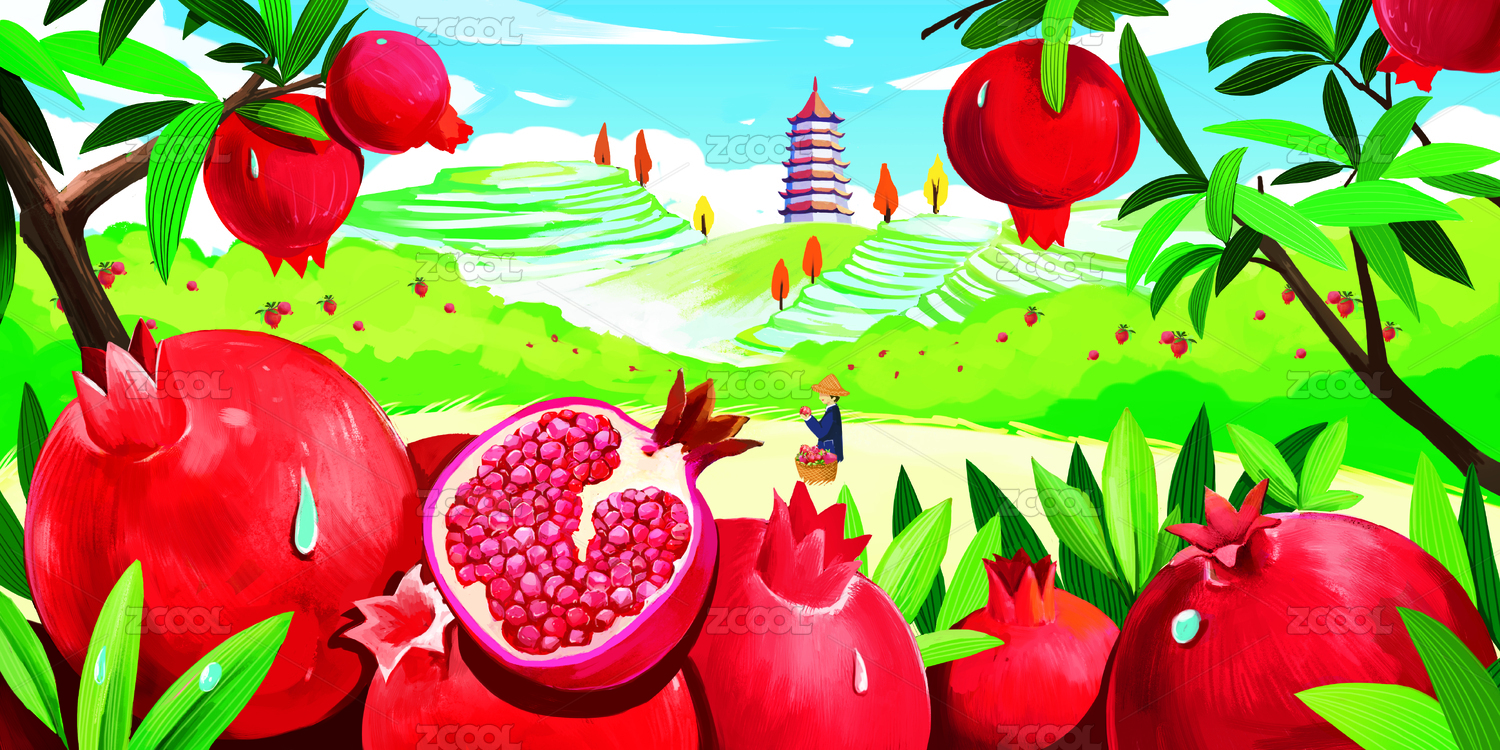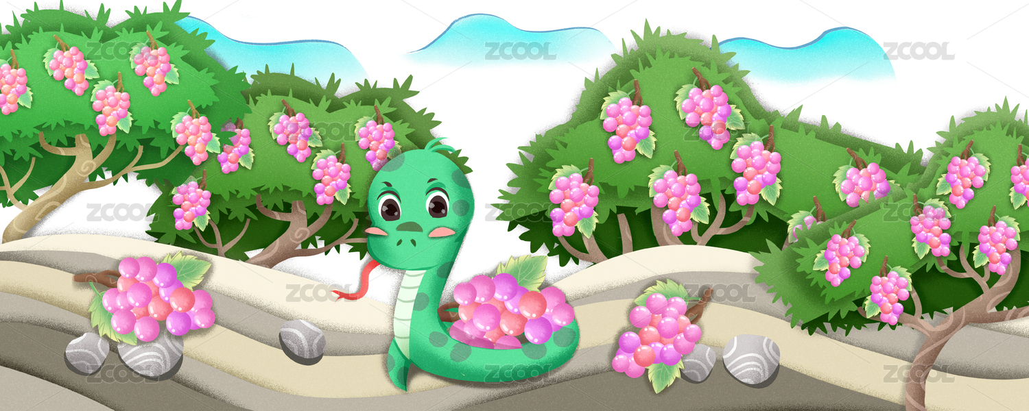 剪紙風(fēng)格可愛的蛇在果園收獲葡萄插畫