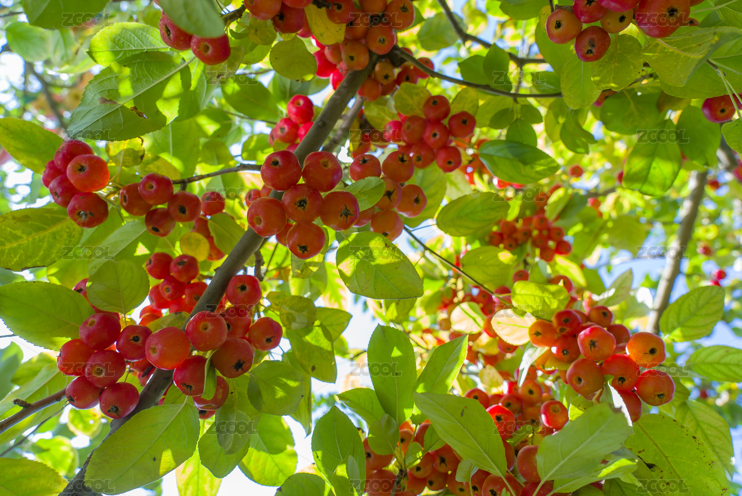 秋天果園里陽光照射下的紅色海棠果水果豐收