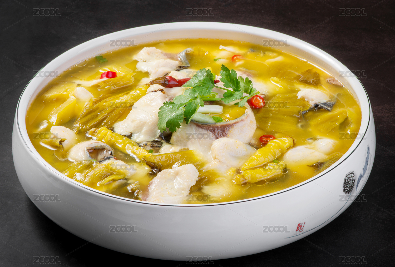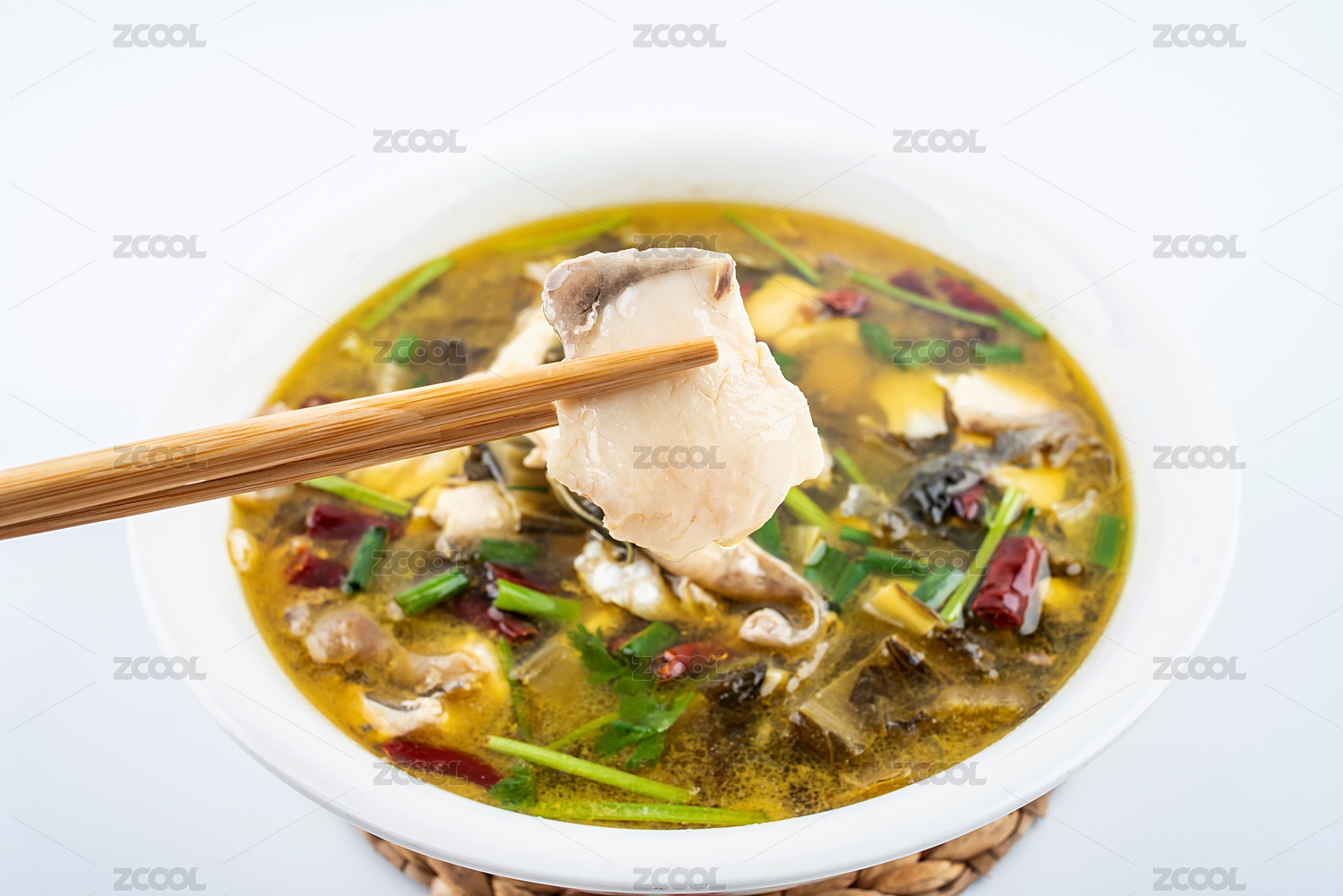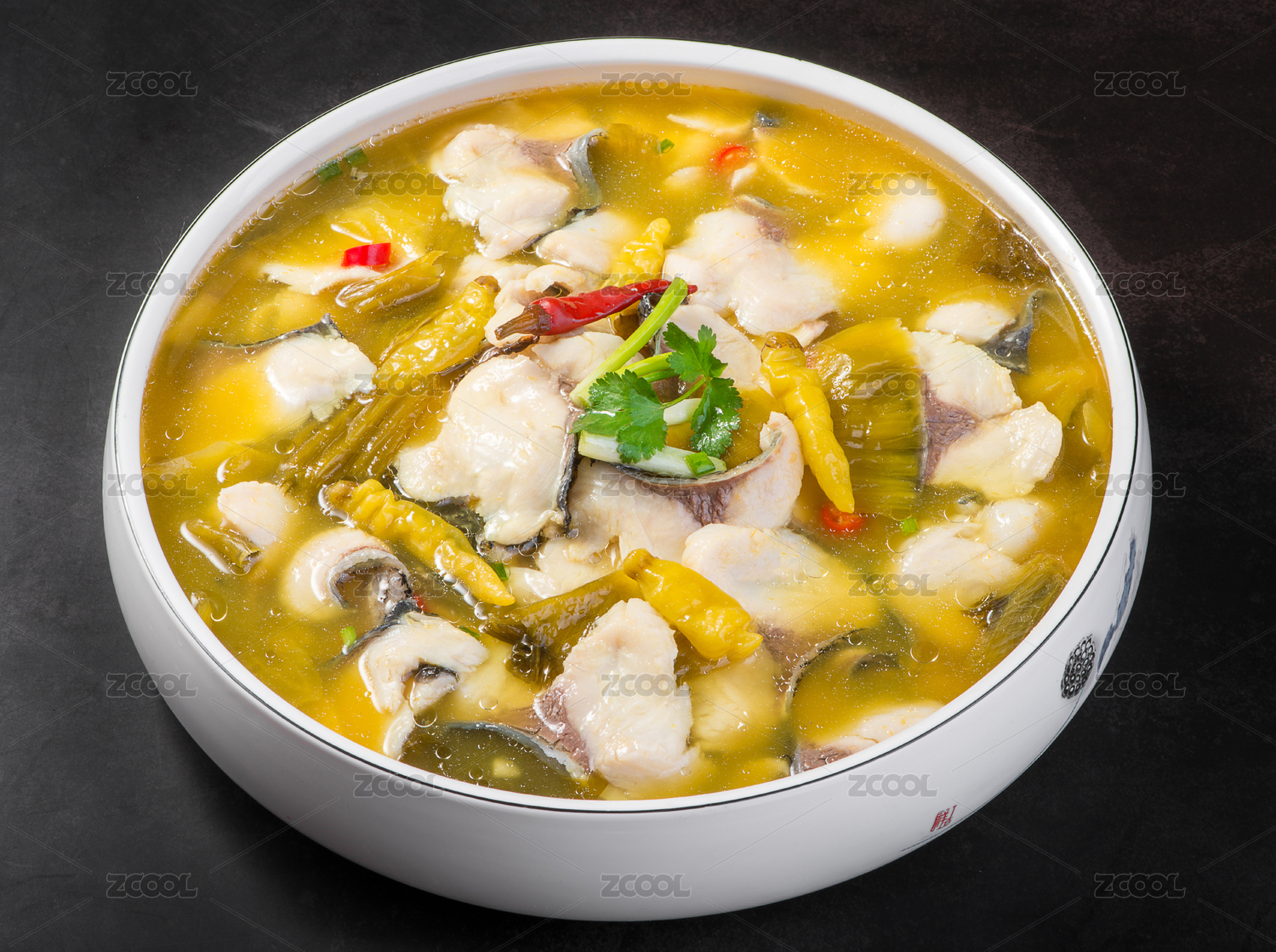中國重慶菜金黃色酸辣可口的酸菜魚特寫