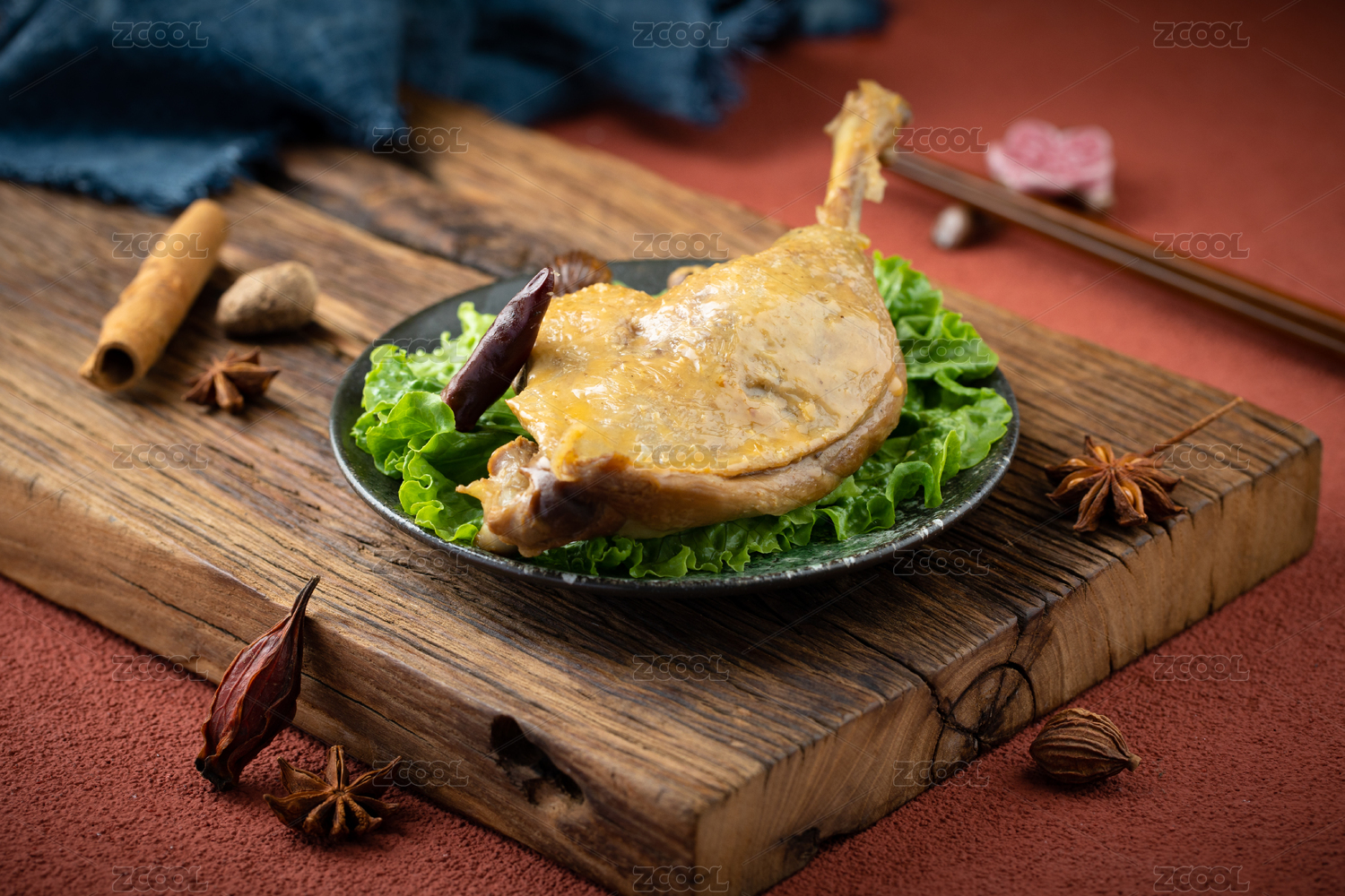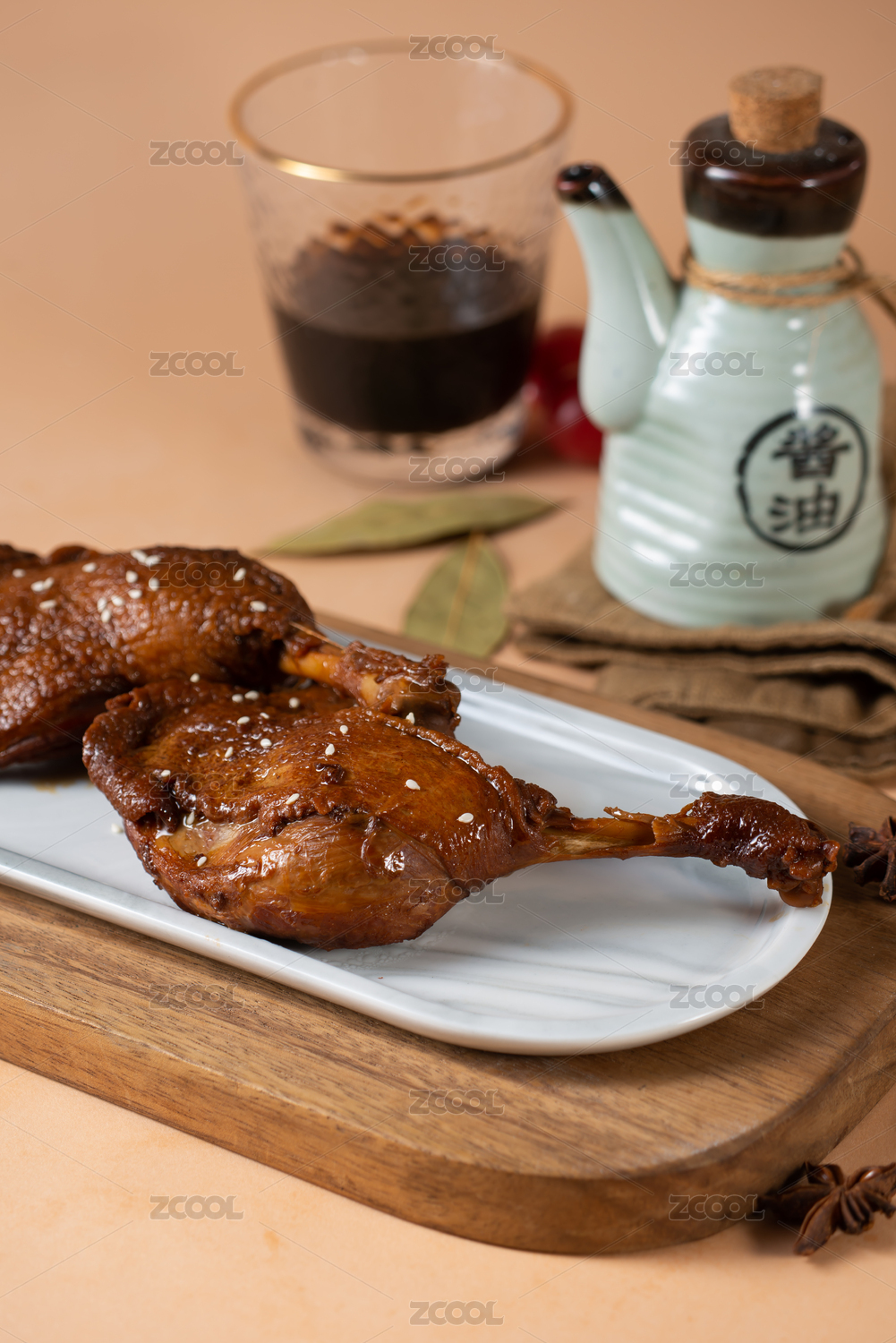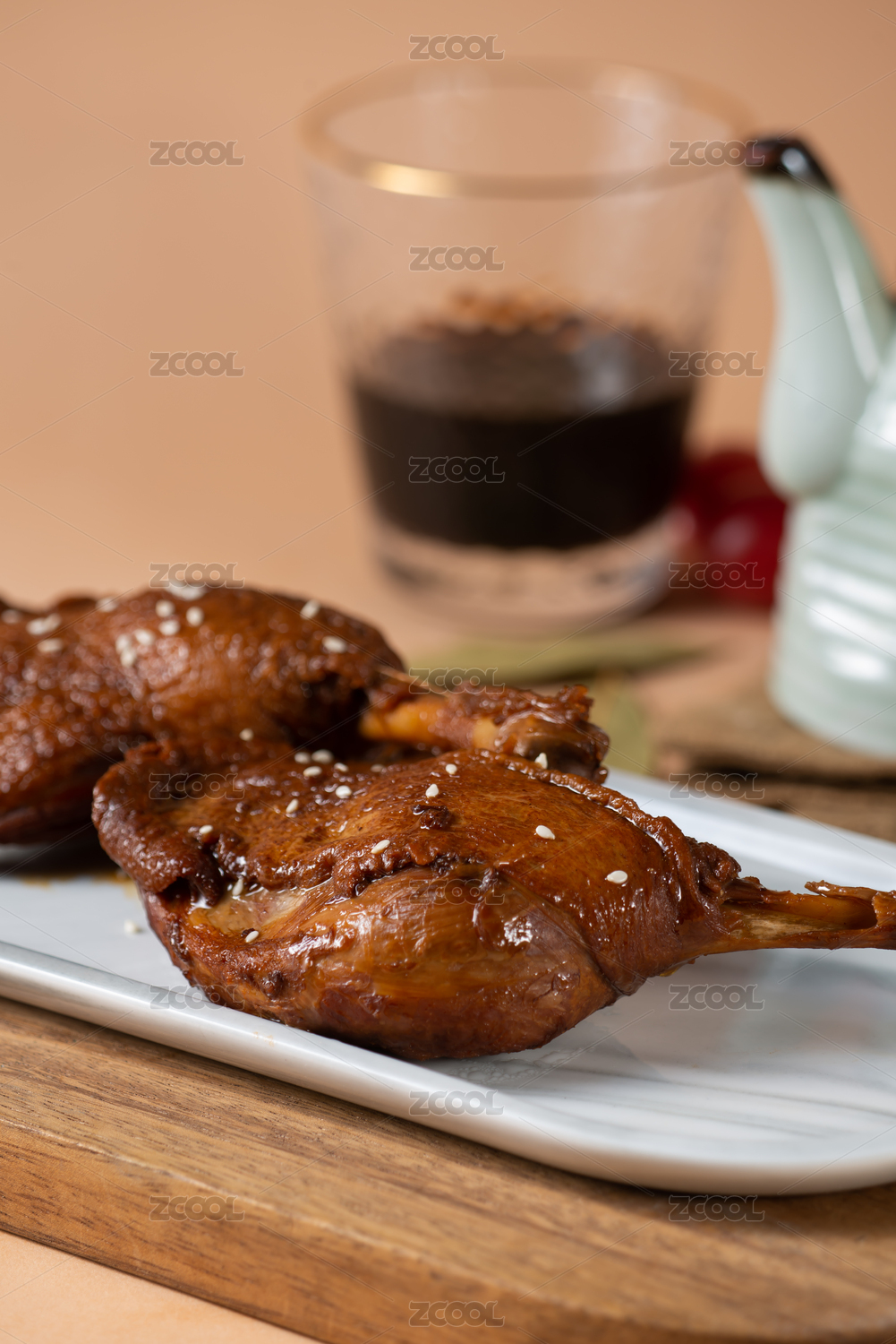 深色木板上擺放的鹵鴨腿