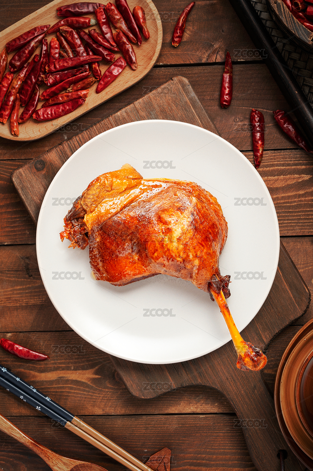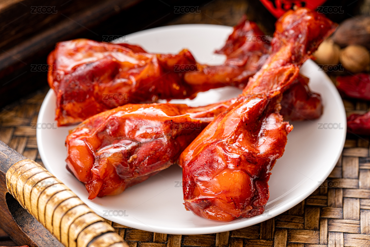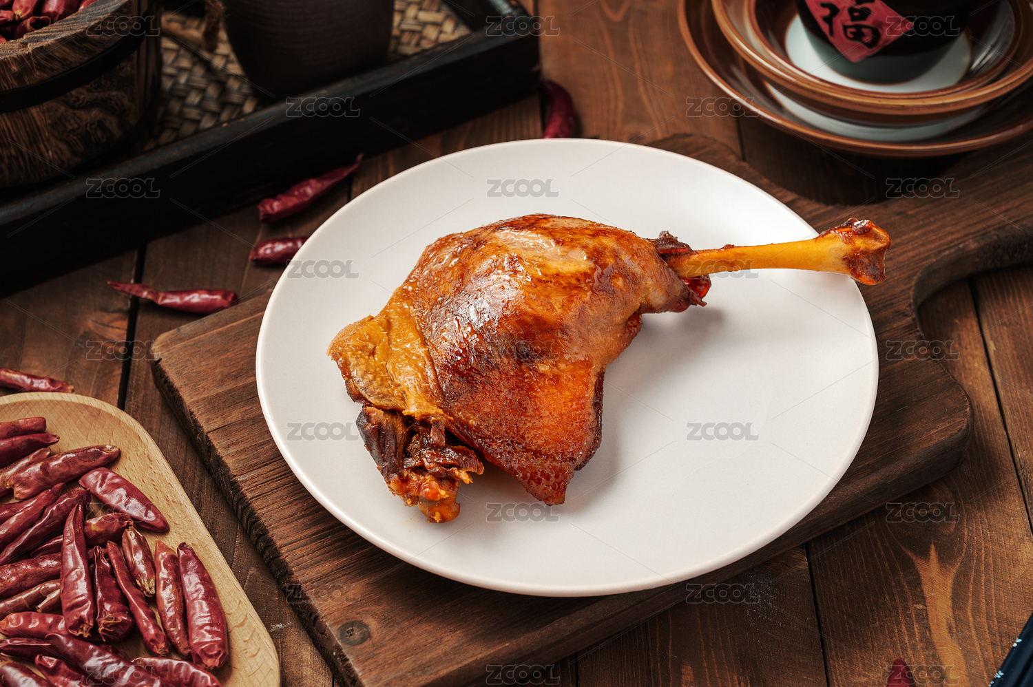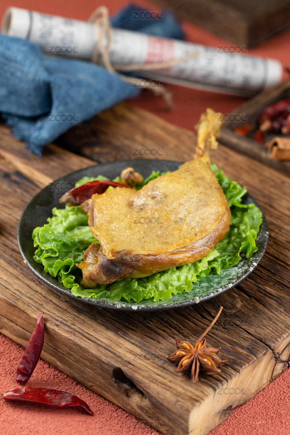 深色木板上擺放的鹵鴨腿