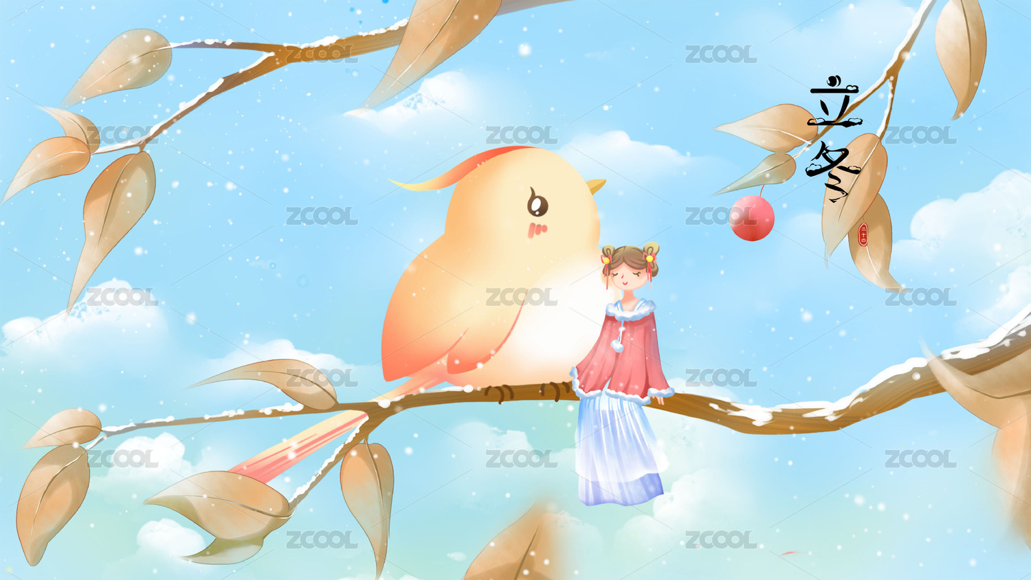 覆蓋著冰雪的樹枝上,拇指女孩依偎著小鳥