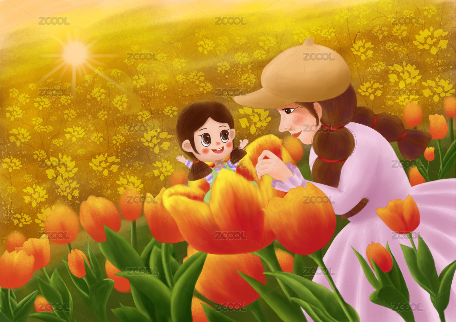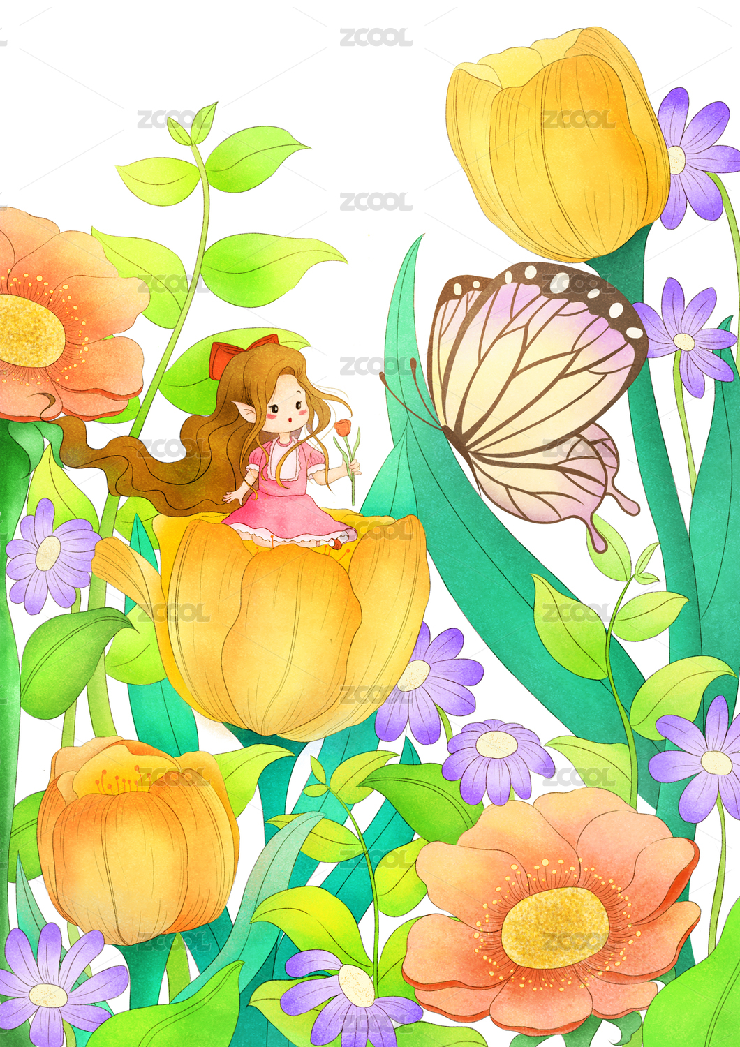 春天的花叢中小女孩坐在郁金香花上