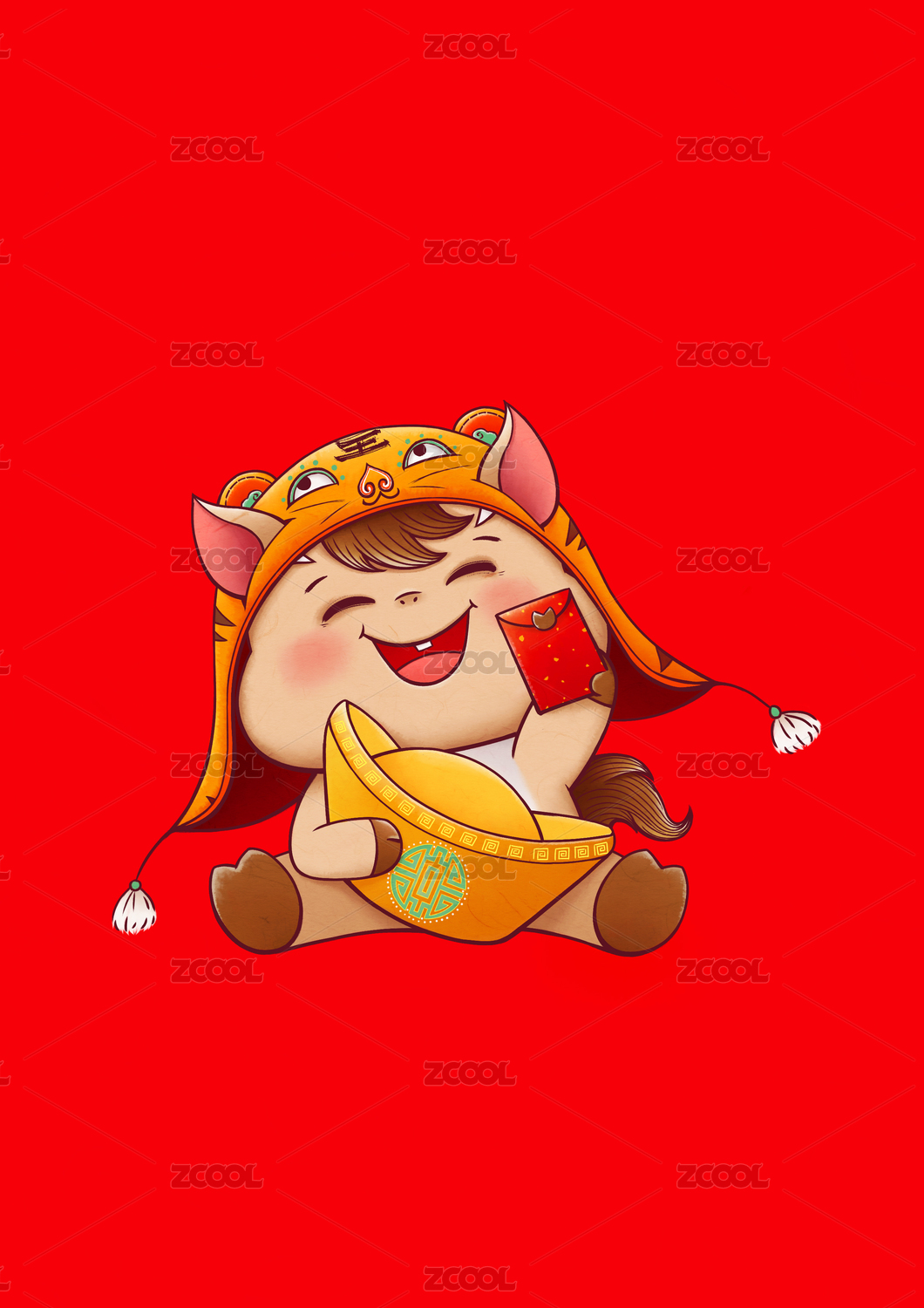 小馬駒抱著金元寶和持著紅包咧嘴笑