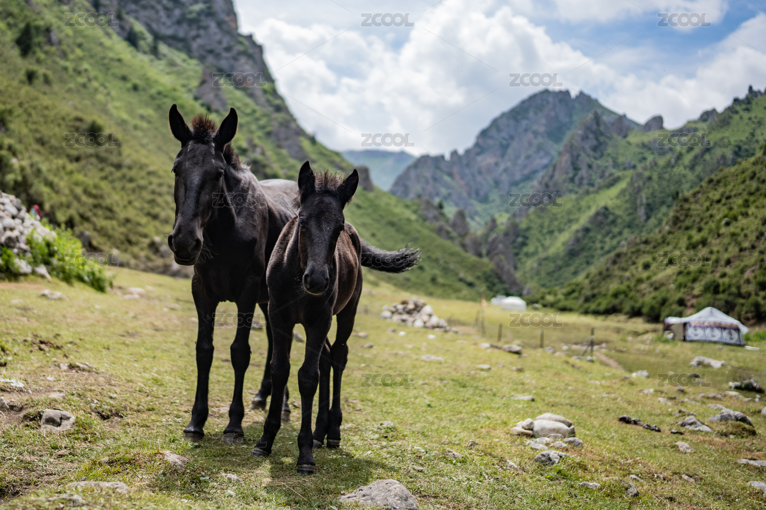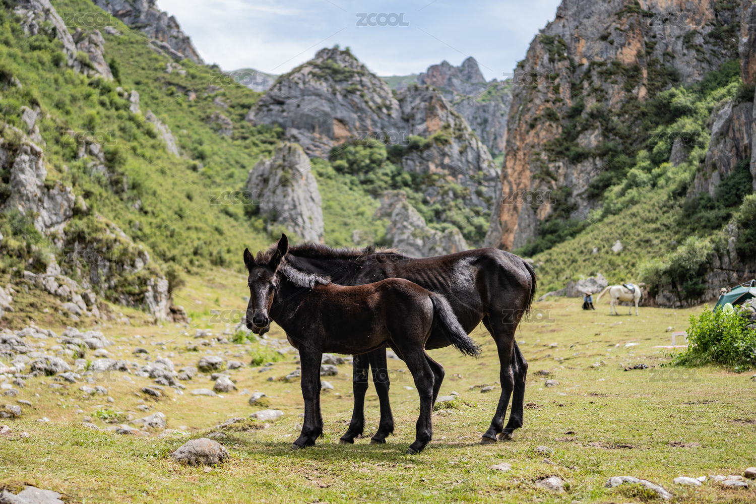 甘肅南部碌曲縣郎木寺景區(qū)母馬帶著小馬駒