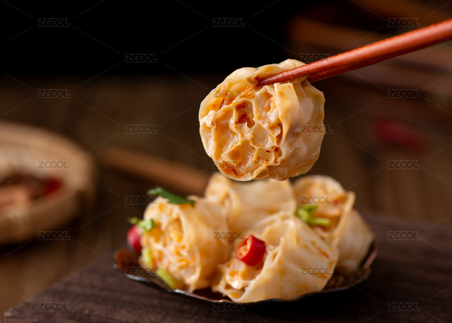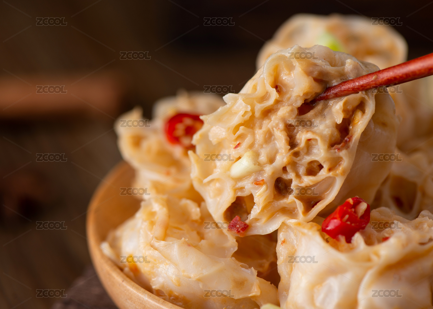 木色背景上筷子夾起的面藕