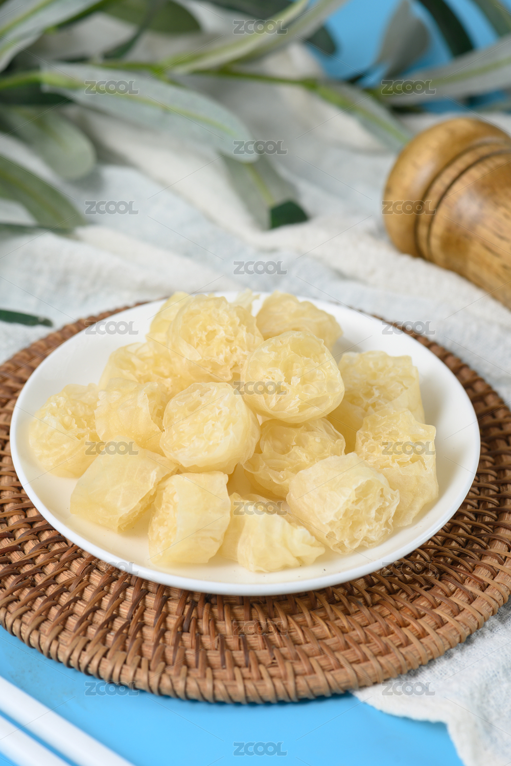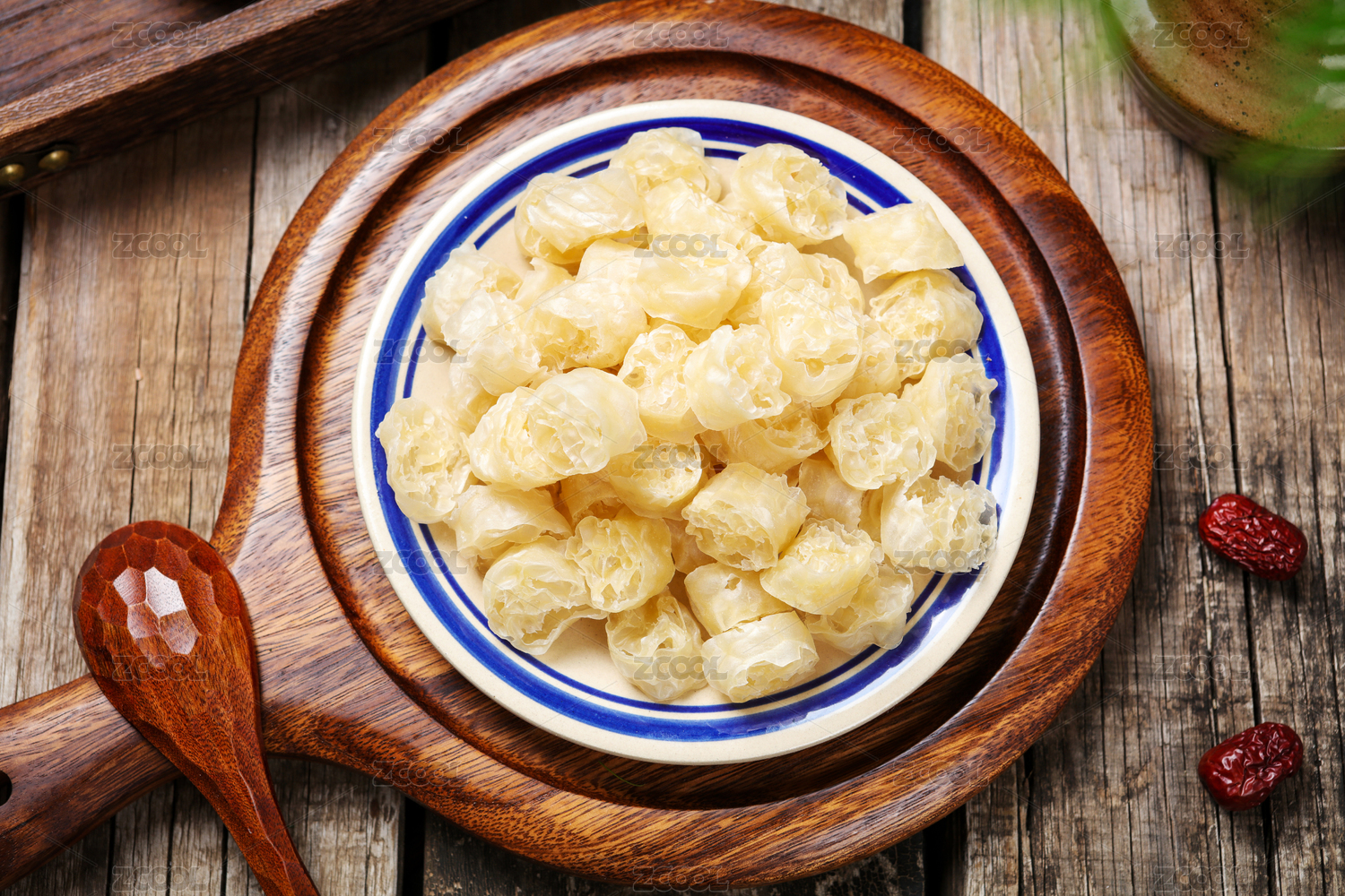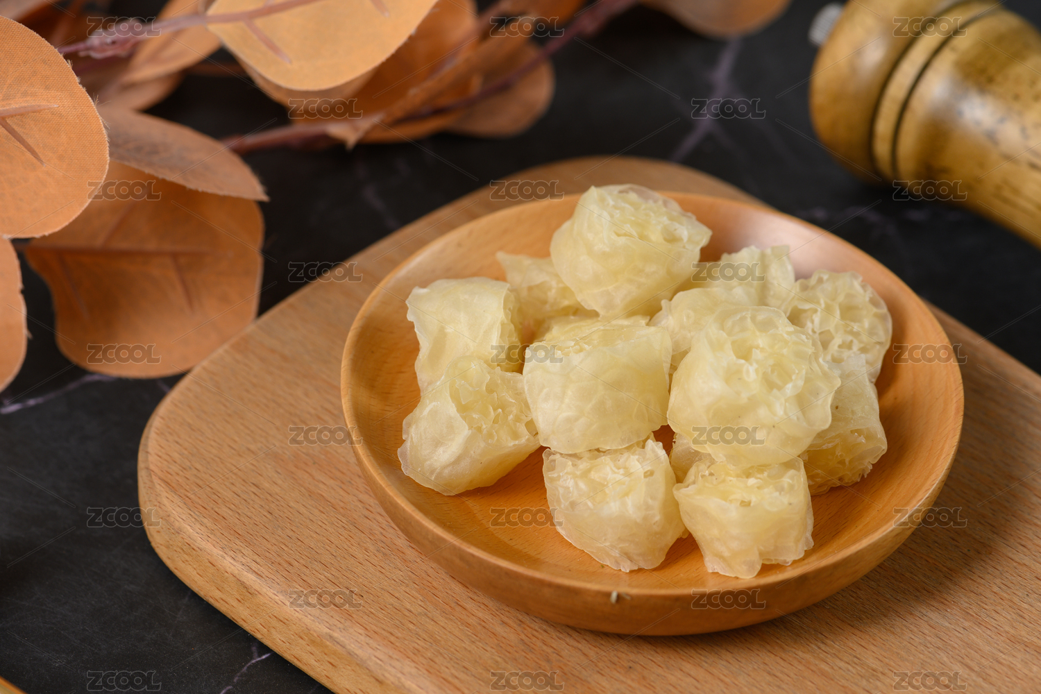 木色背景上餐具里盛放的面藕
