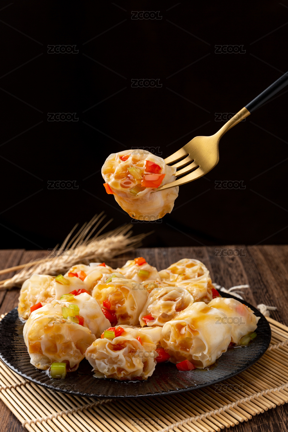 黑色背景上筷子夾起的面藕