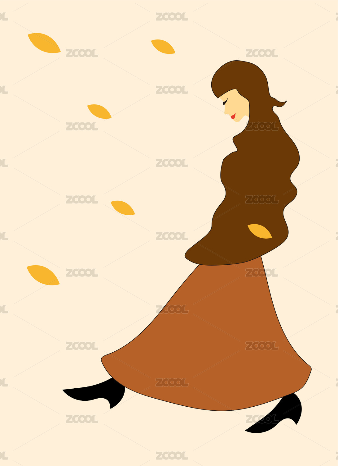 秋天一個女孩走在路上落葉飄落時尚插畫
