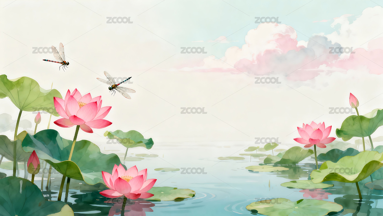 池塘荷花蜻蜓飛舞美景