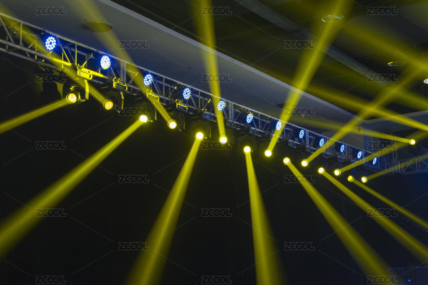 深色背景前,顏色絢麗的舞臺(tái)射燈交相輝映