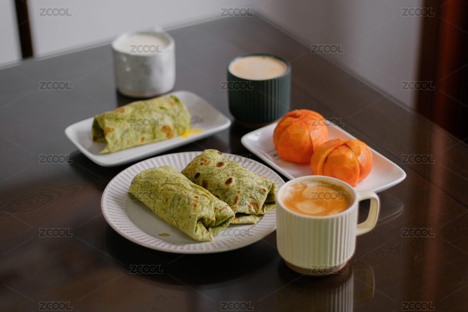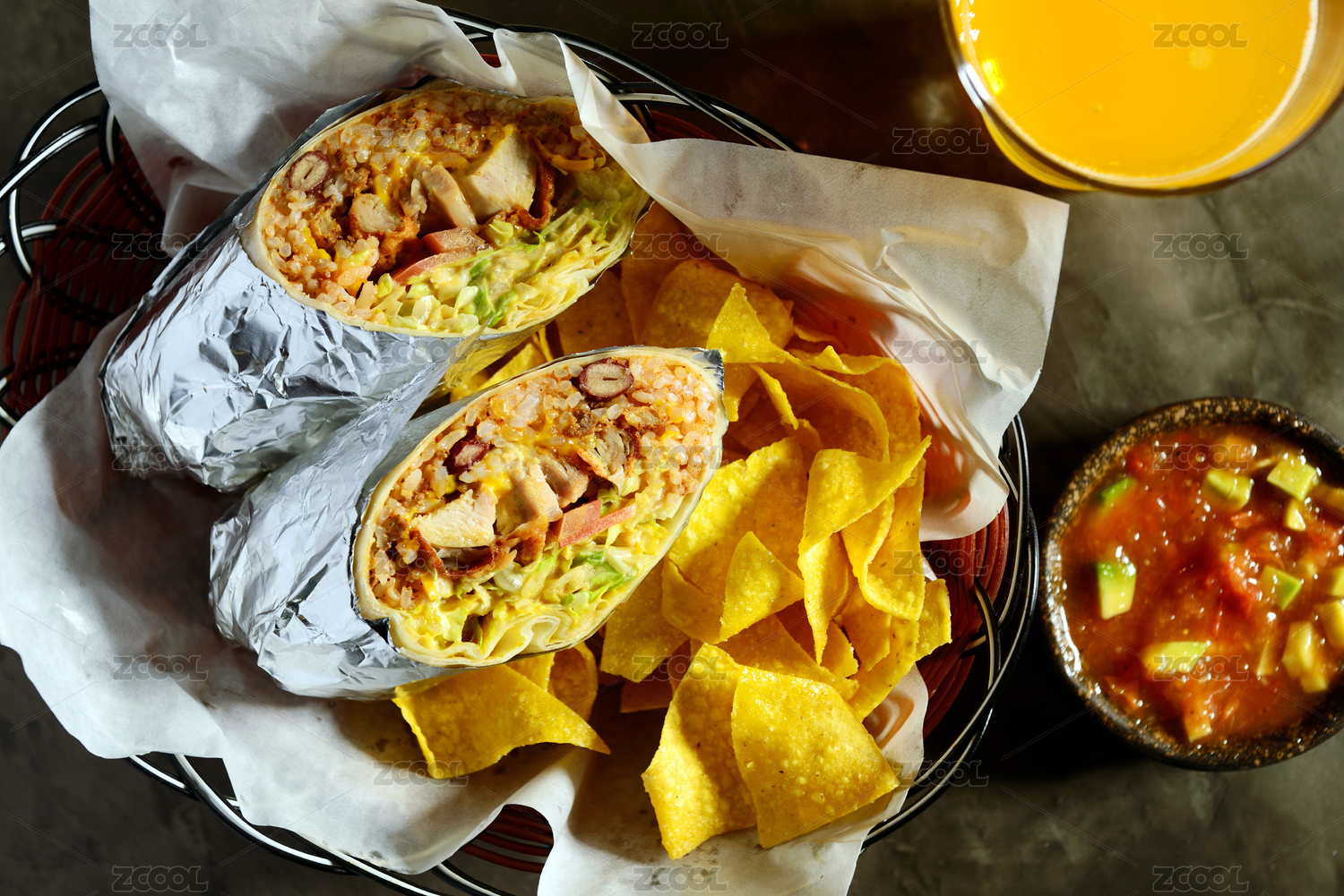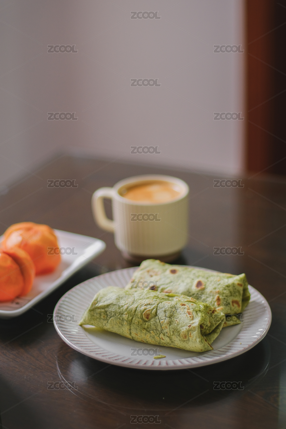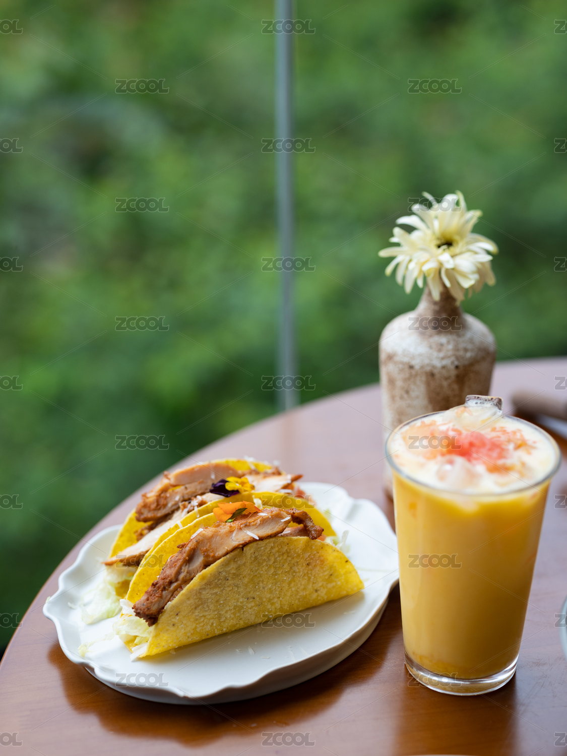 干凈室內(nèi)窗邊桌上擺的墨西哥卷餅與飲料特寫