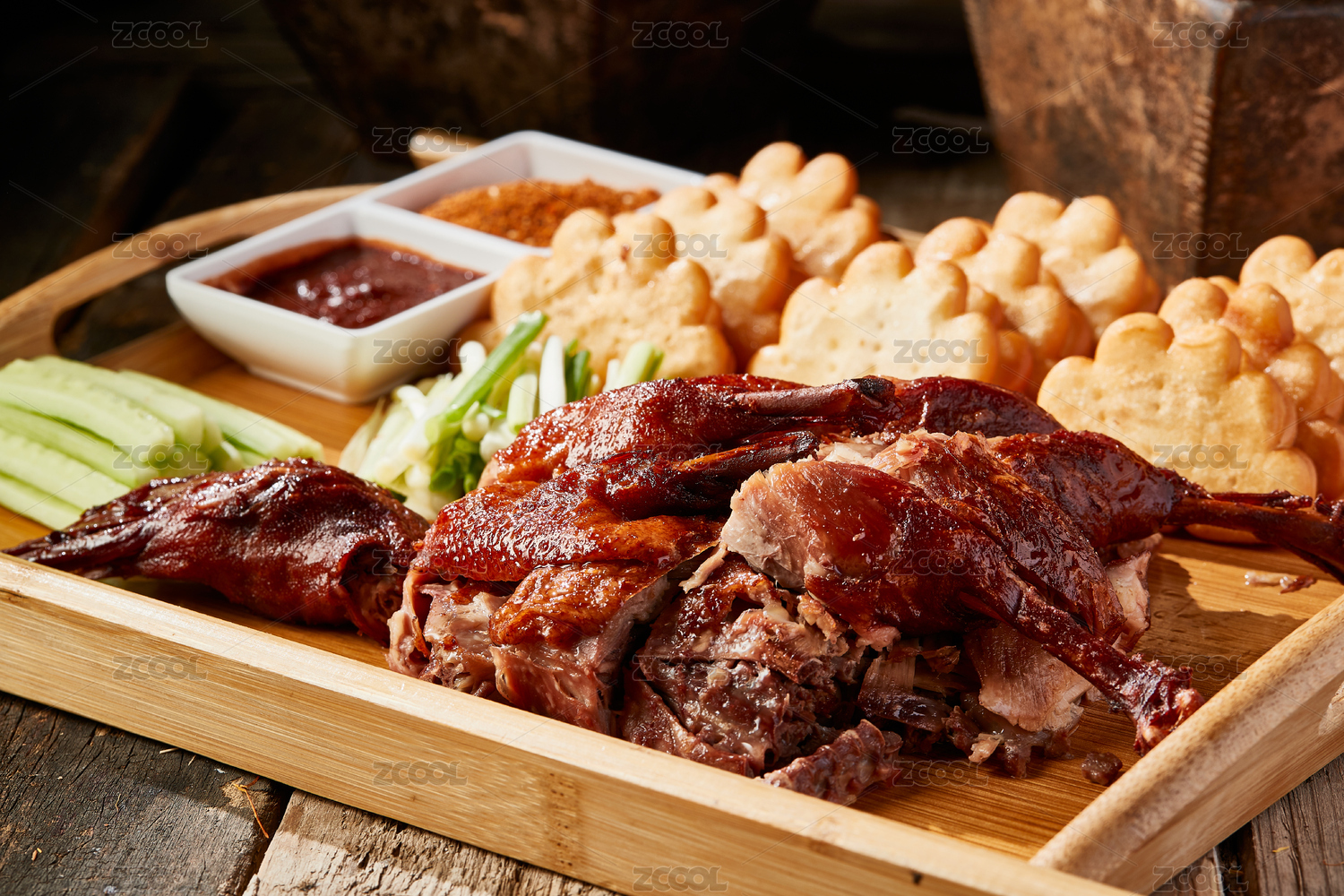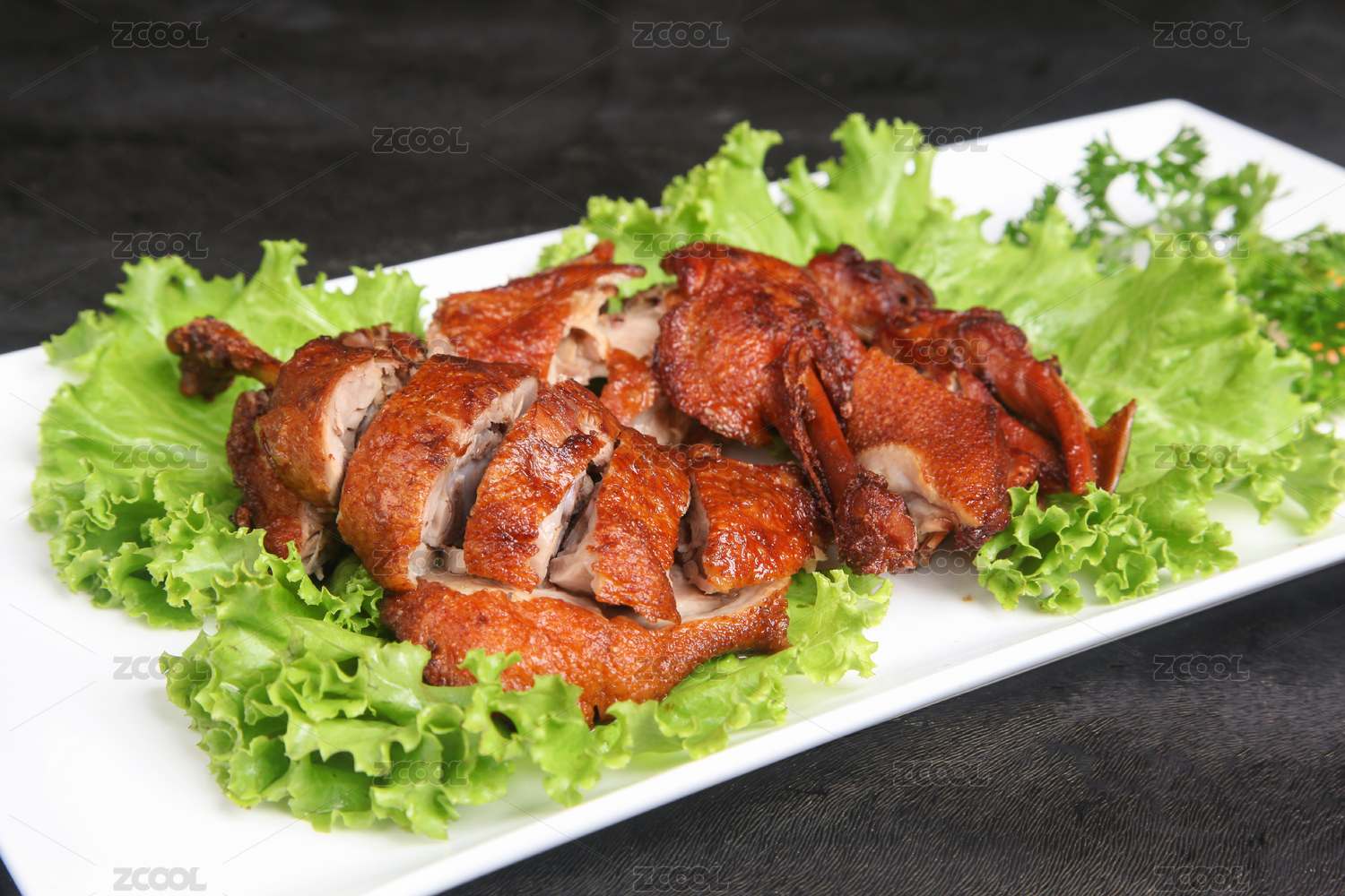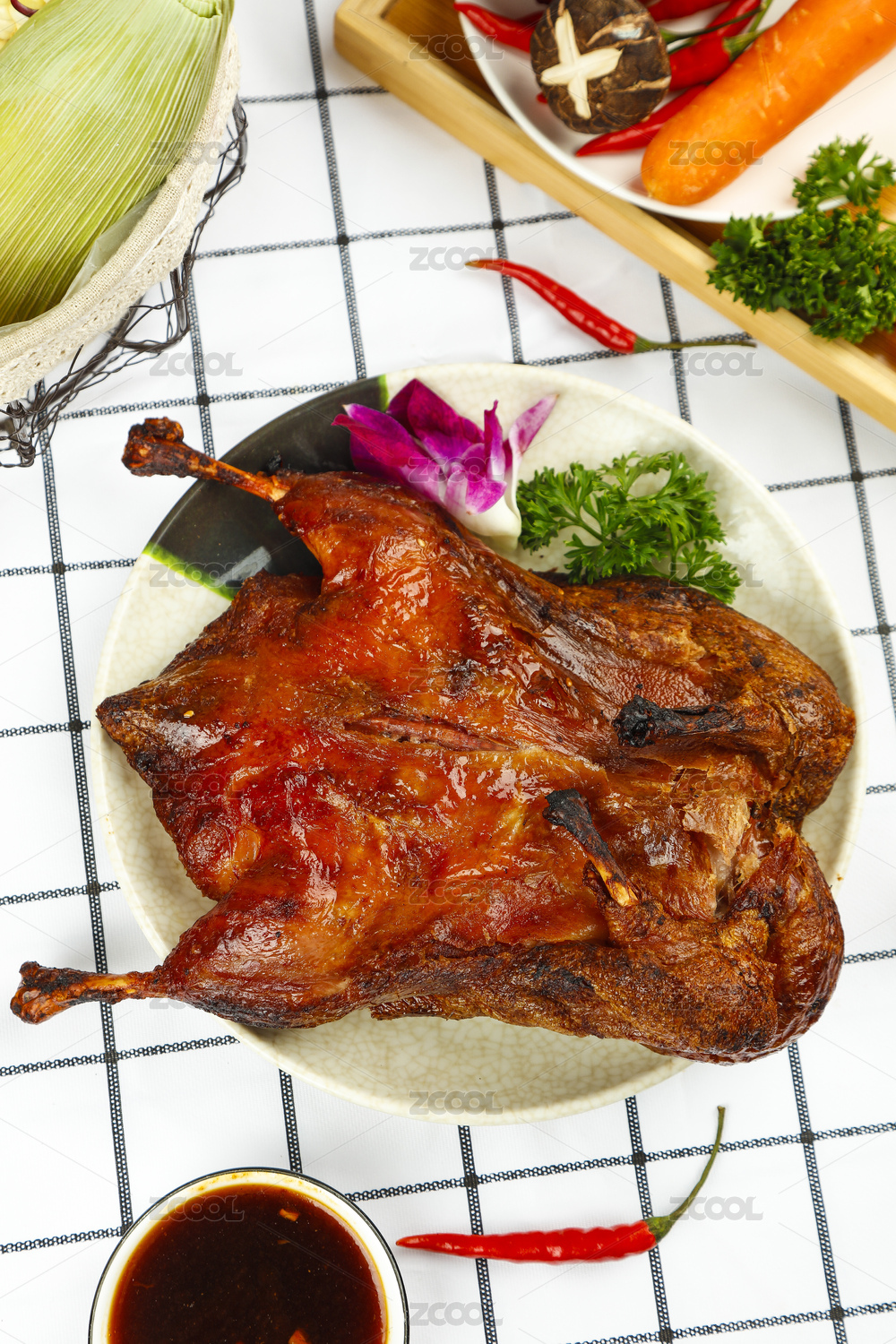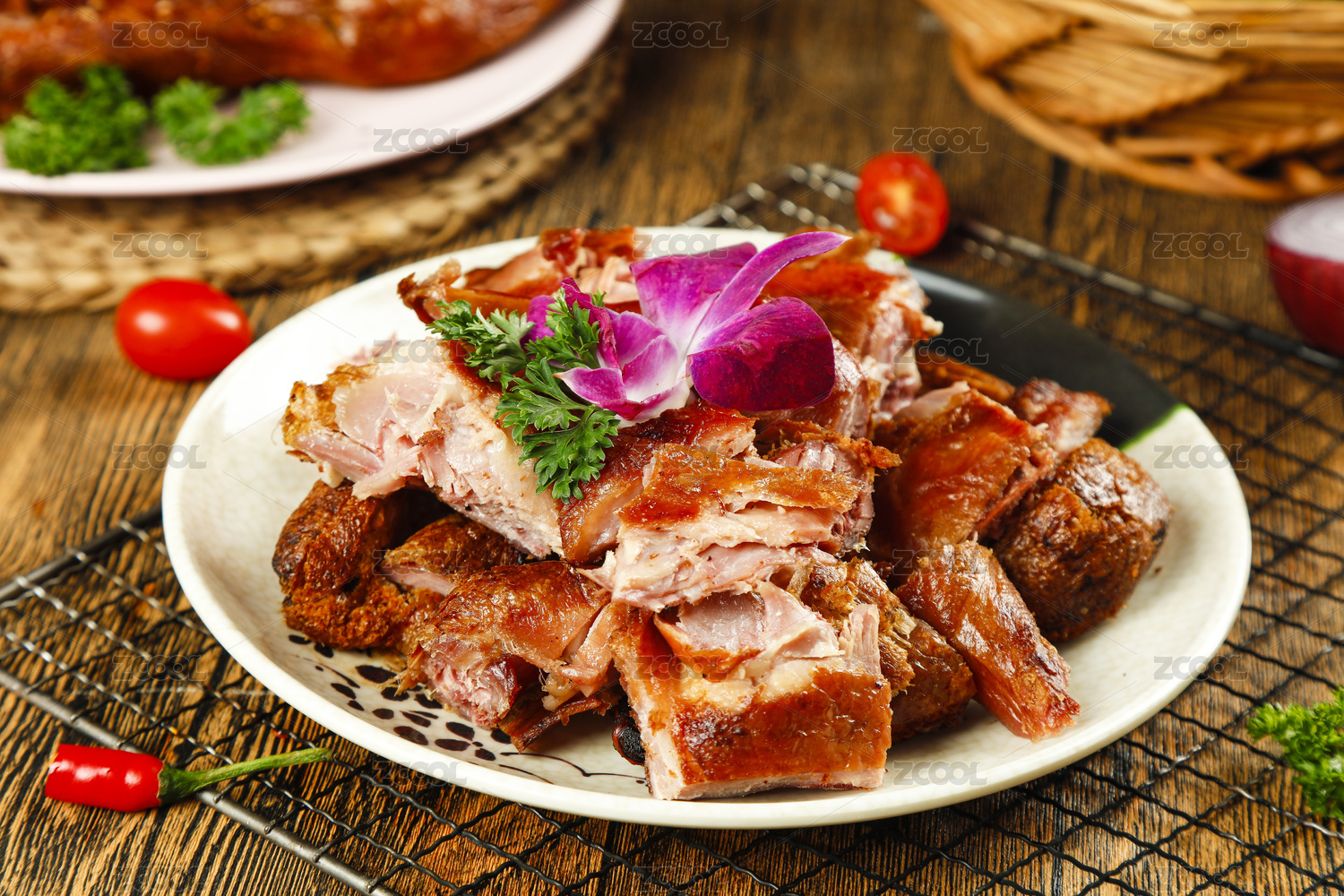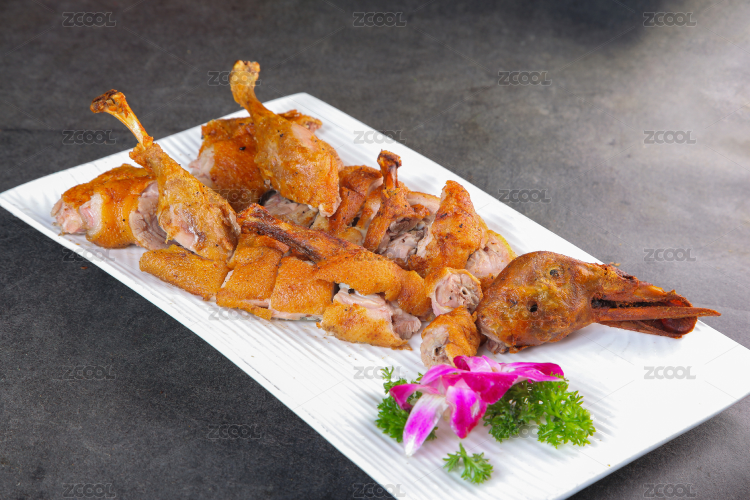 燒烤網(wǎng)上放著一盤切塊的香酥鴨