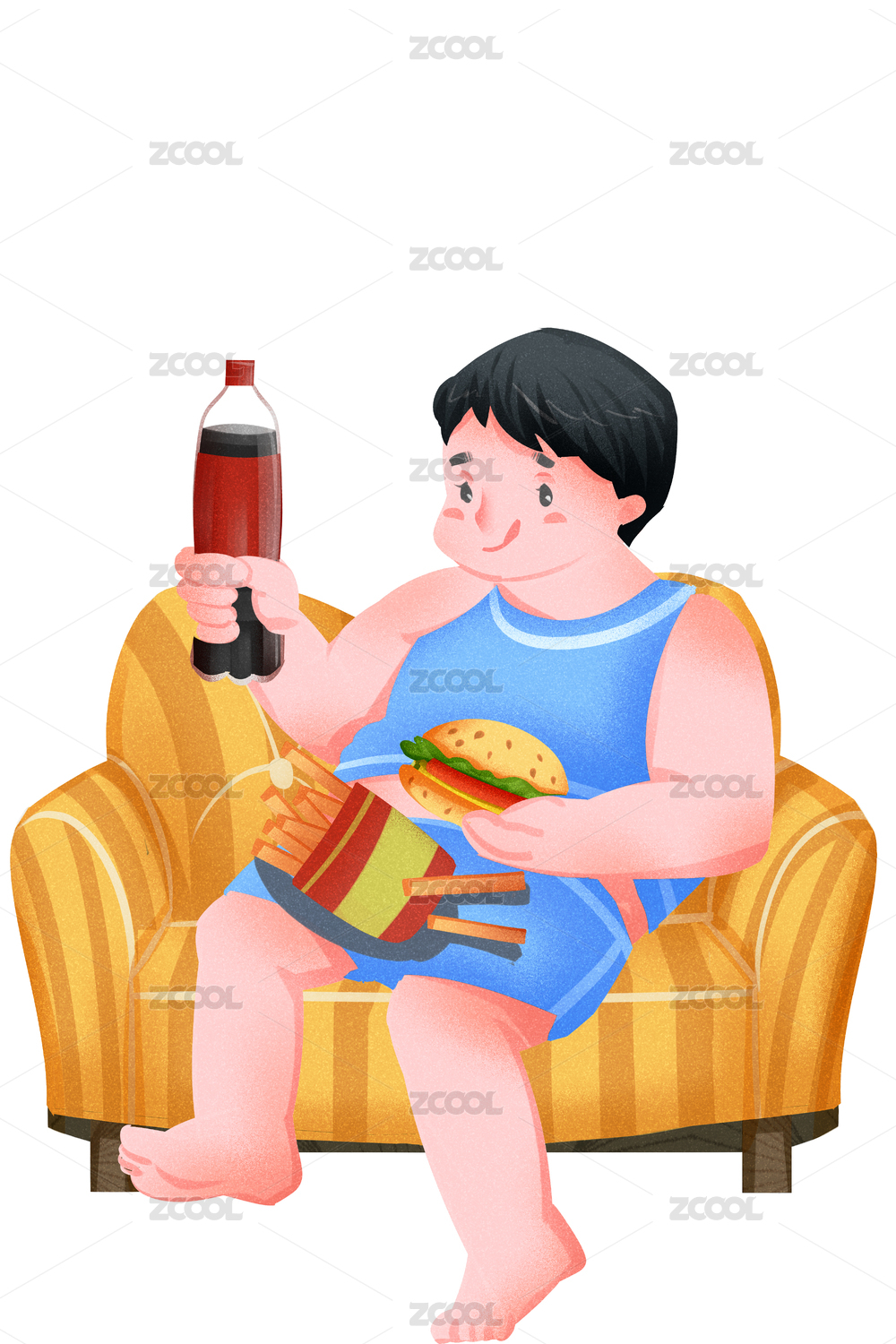 肥胖男孩坐在沙發(fā)上吃垃圾食物 可愛風(fēng)格世界高血壓日插畫人物元素