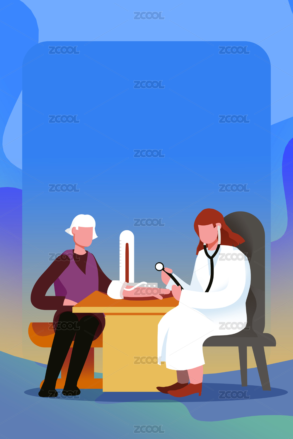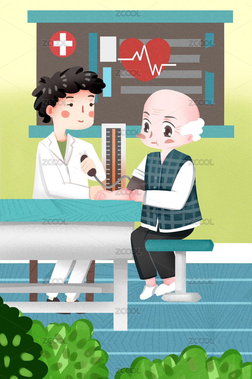 卡通手繪全國高血壓日老人問診醫(yī)療體檢插畫