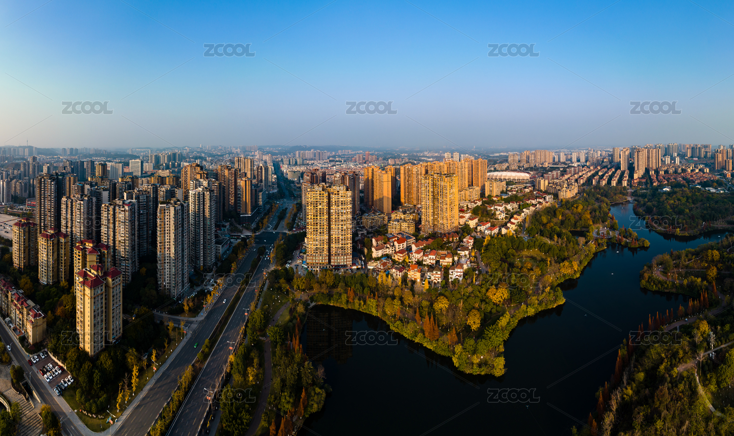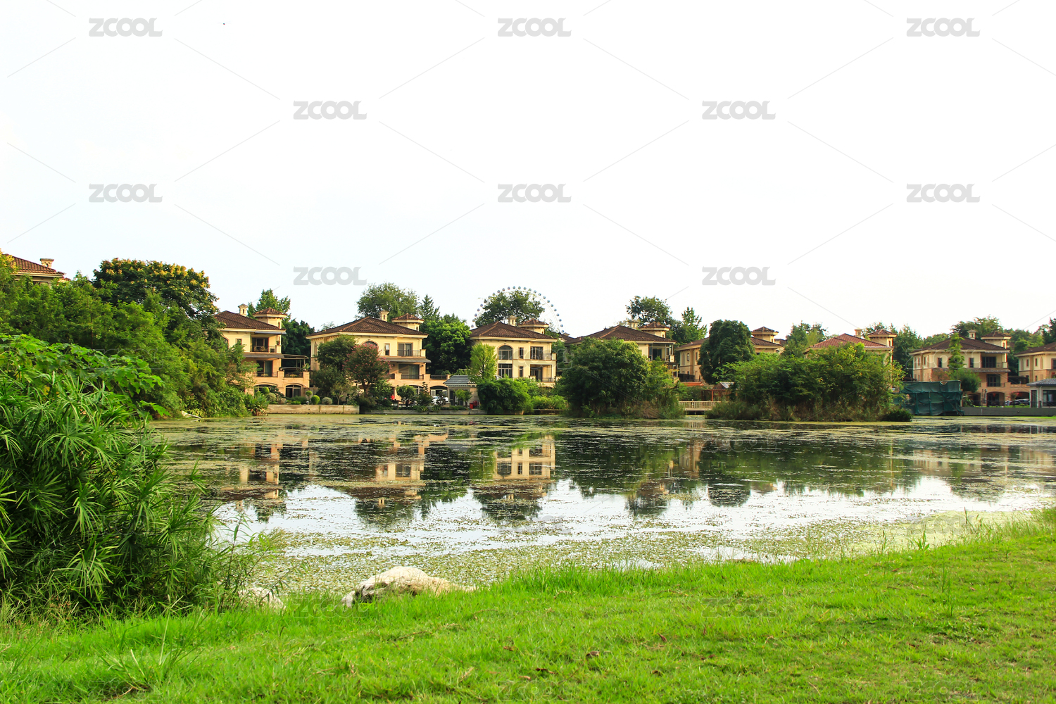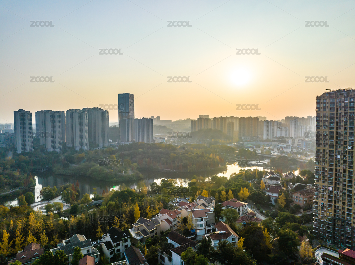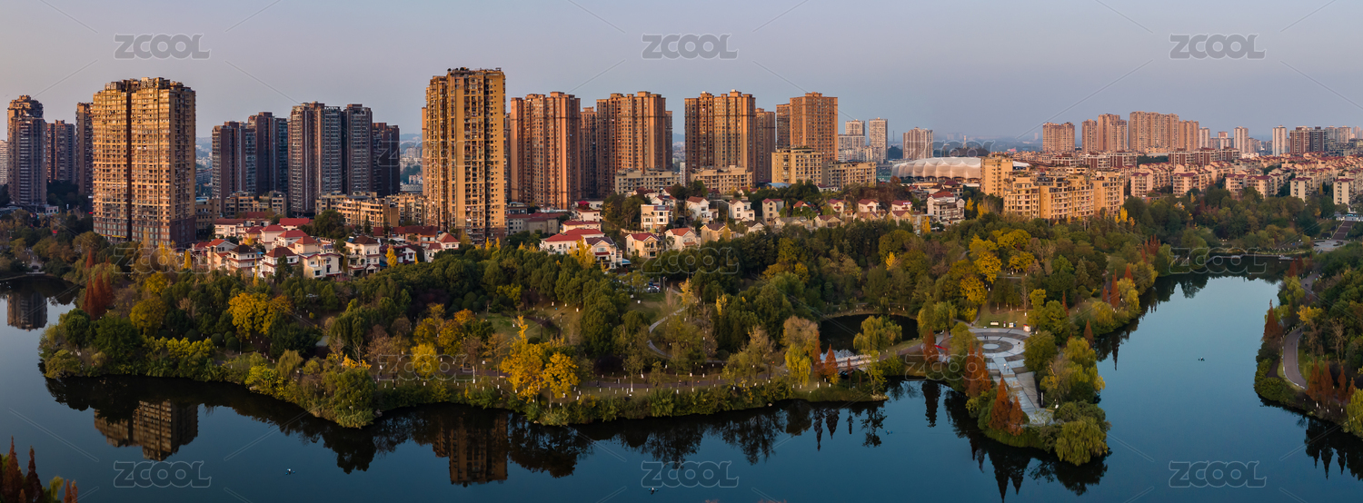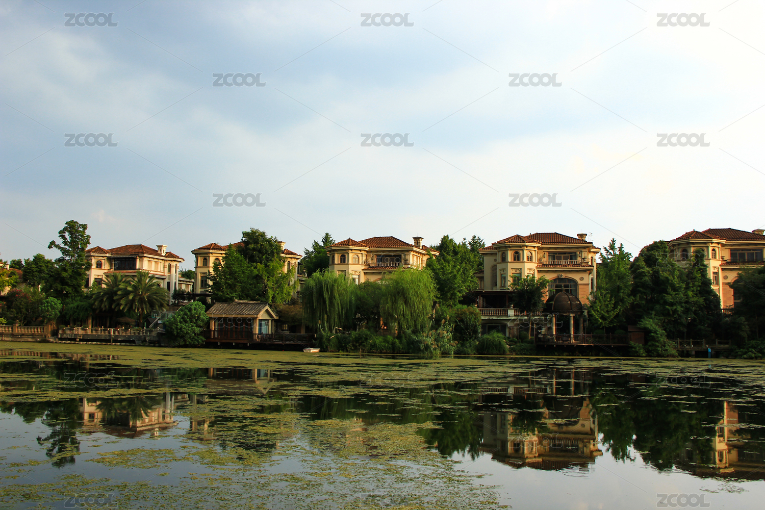 傍晚時分的湖畔別墅群