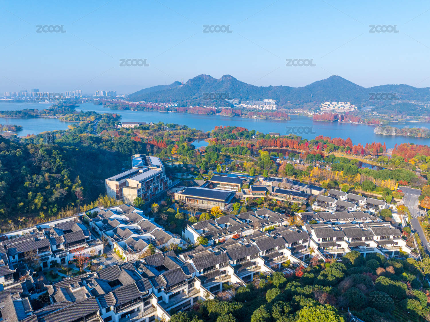 湖畔別墅群與遠山秋景