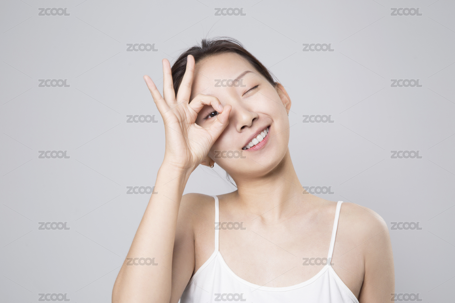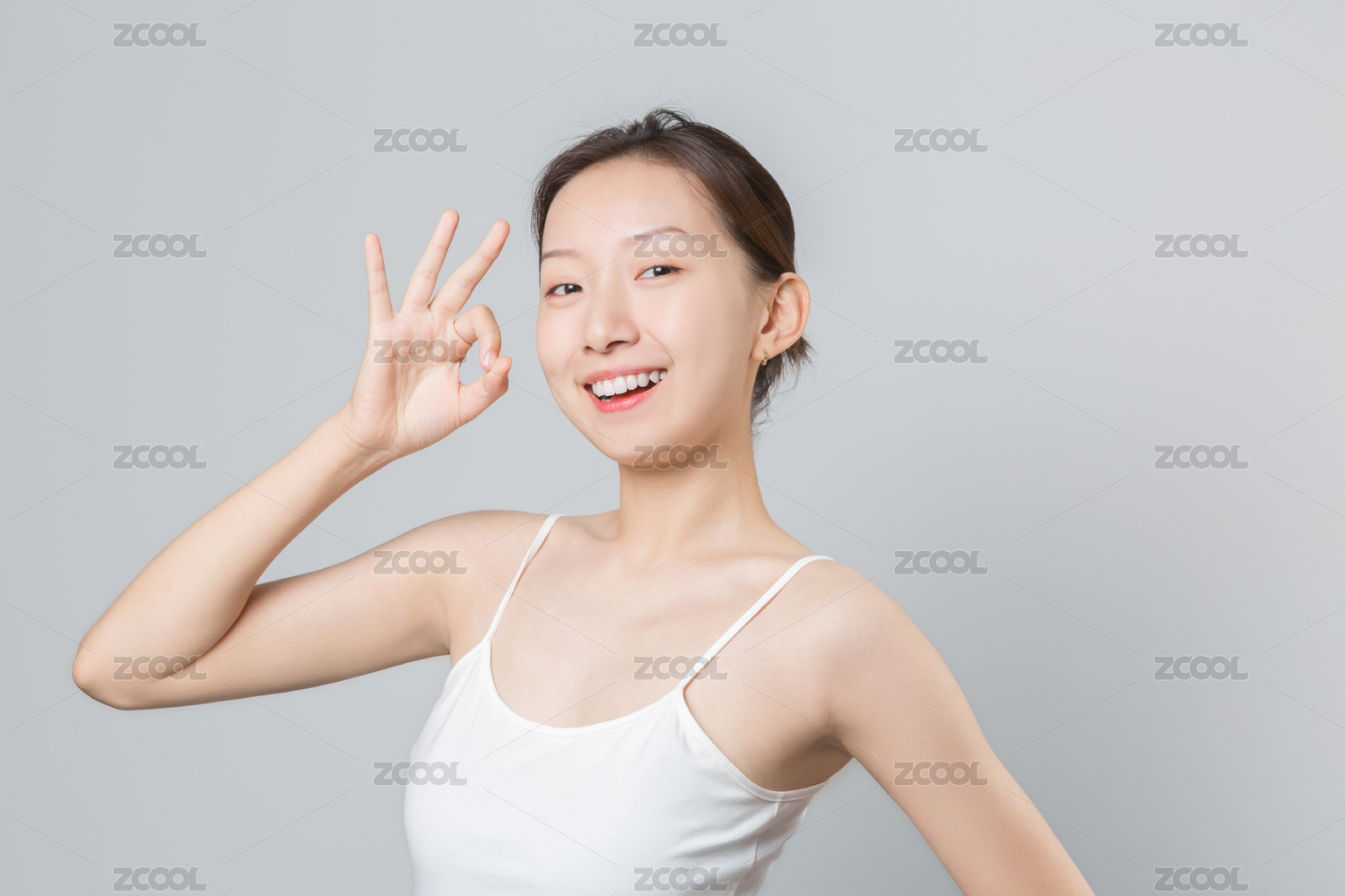 一位美麗的亞裔女孩站在純色背景前面帶微笑比出一個(gè)“ok”的手勢(shì)