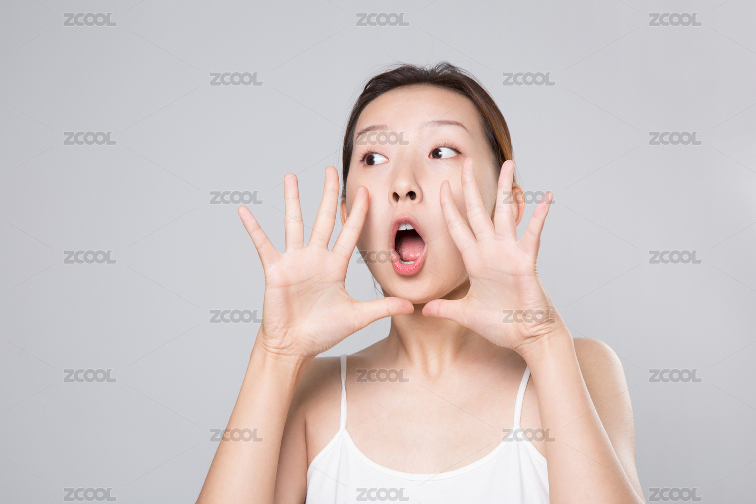 一位美麗的亞裔女孩站在純色背景前大聲呼喊