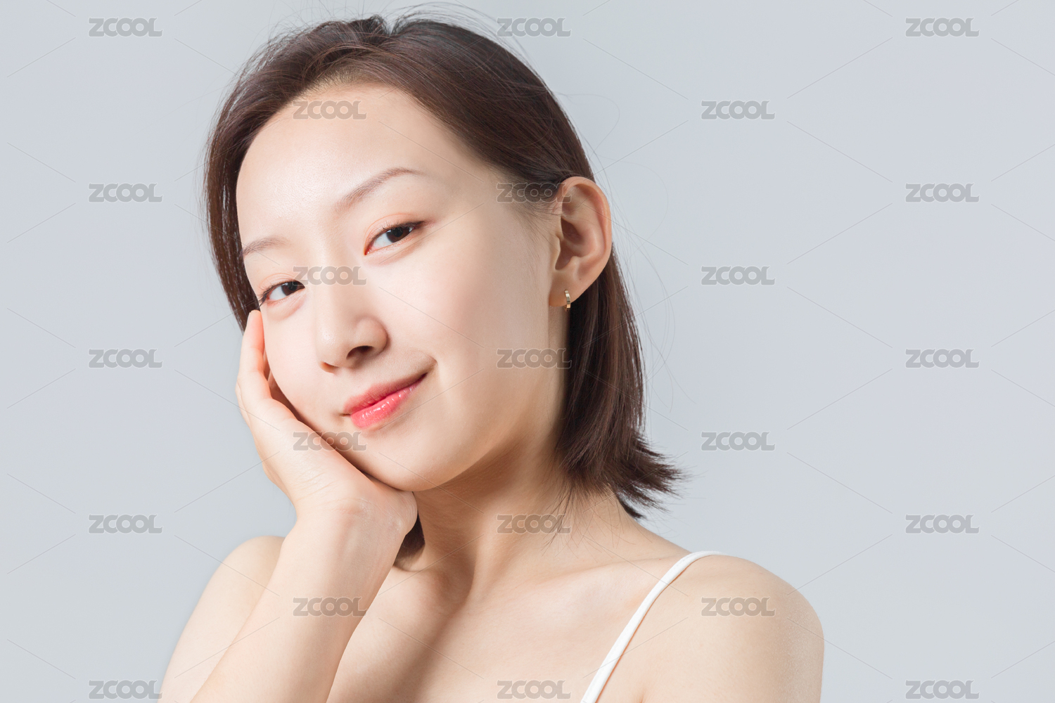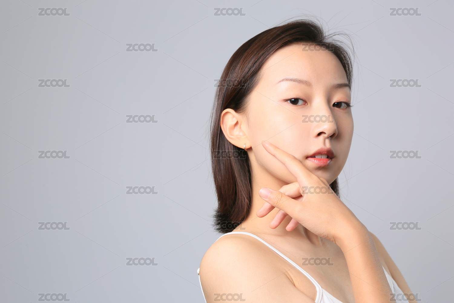 一位美麗的亞裔女孩站在純色背景墻前用手背輕撫臉頰