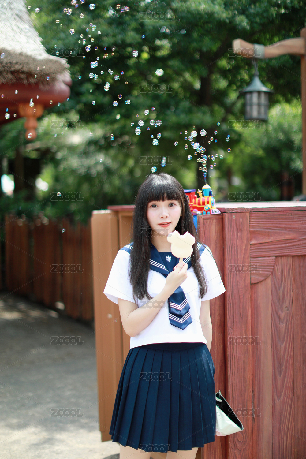 一名美麗的亞洲女性在游樂(lè)場(chǎng)里吃冰淇淋