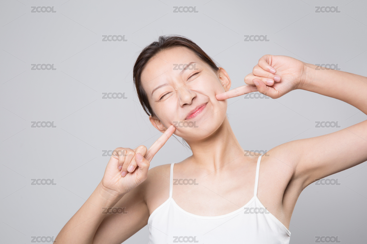 一位美麗的亞裔女孩站在純色背景雙手戳酒窩瞇著眼睛微笑