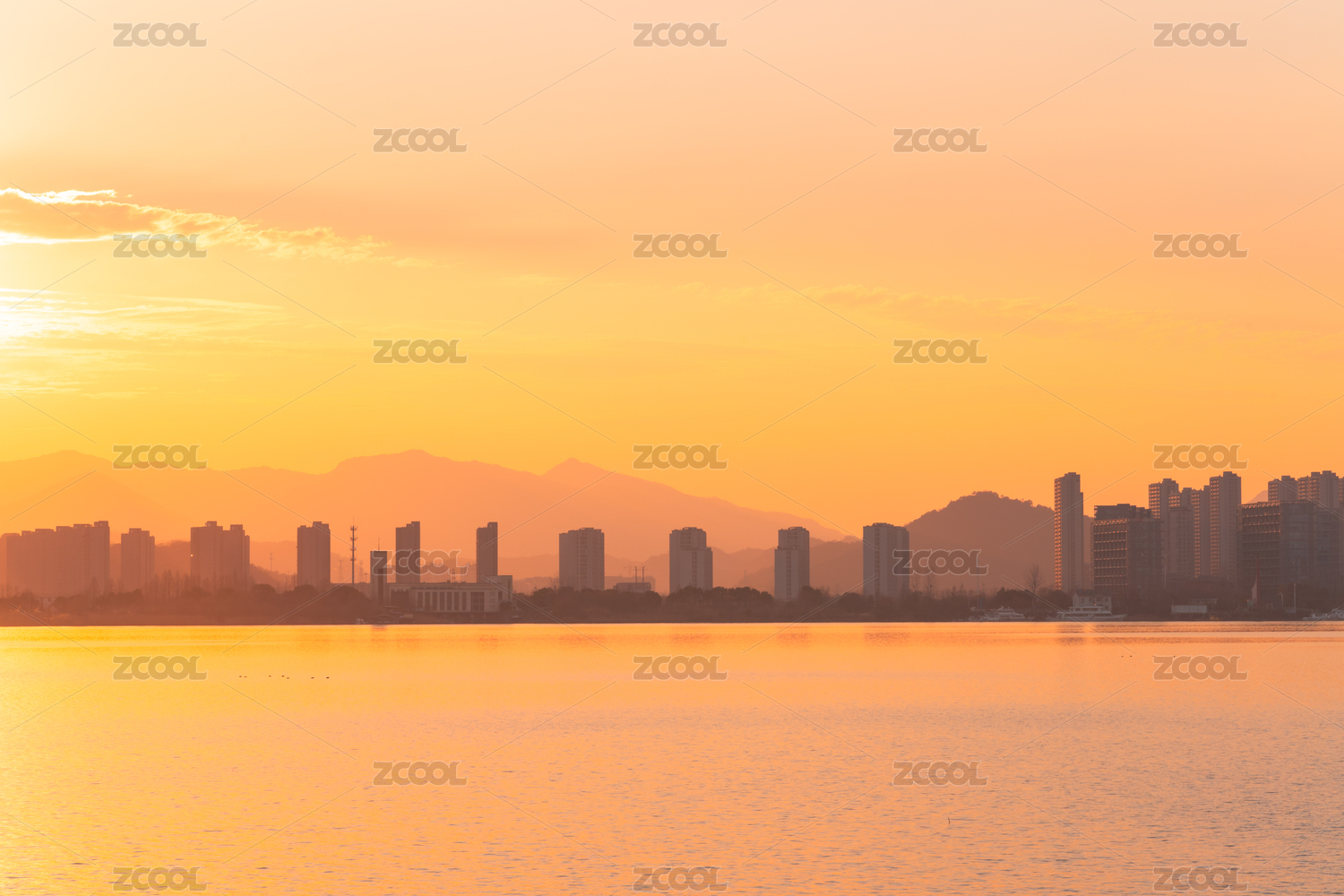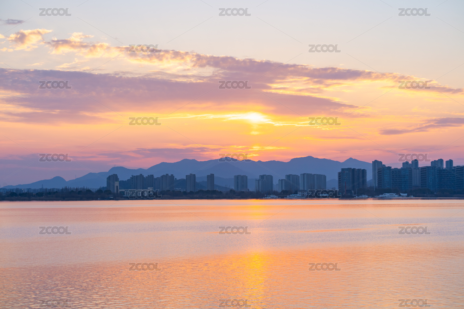 落日黃昏日柱天象下的杭州之江版塊城市建筑