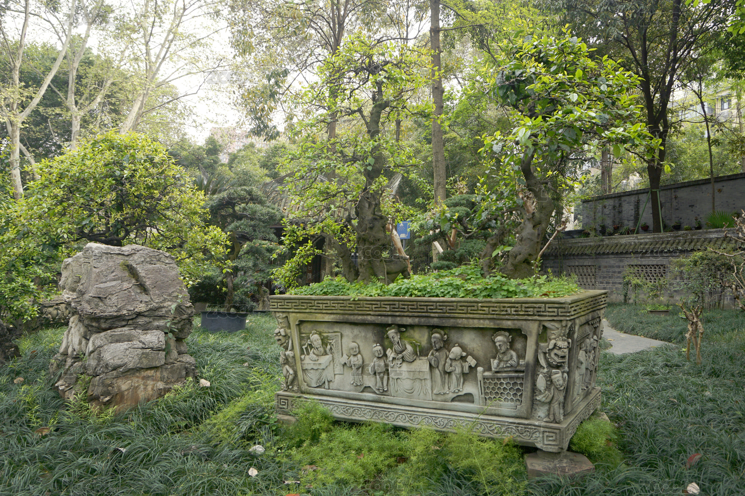四川成都人民公園 盆景園石雕花盆盆景