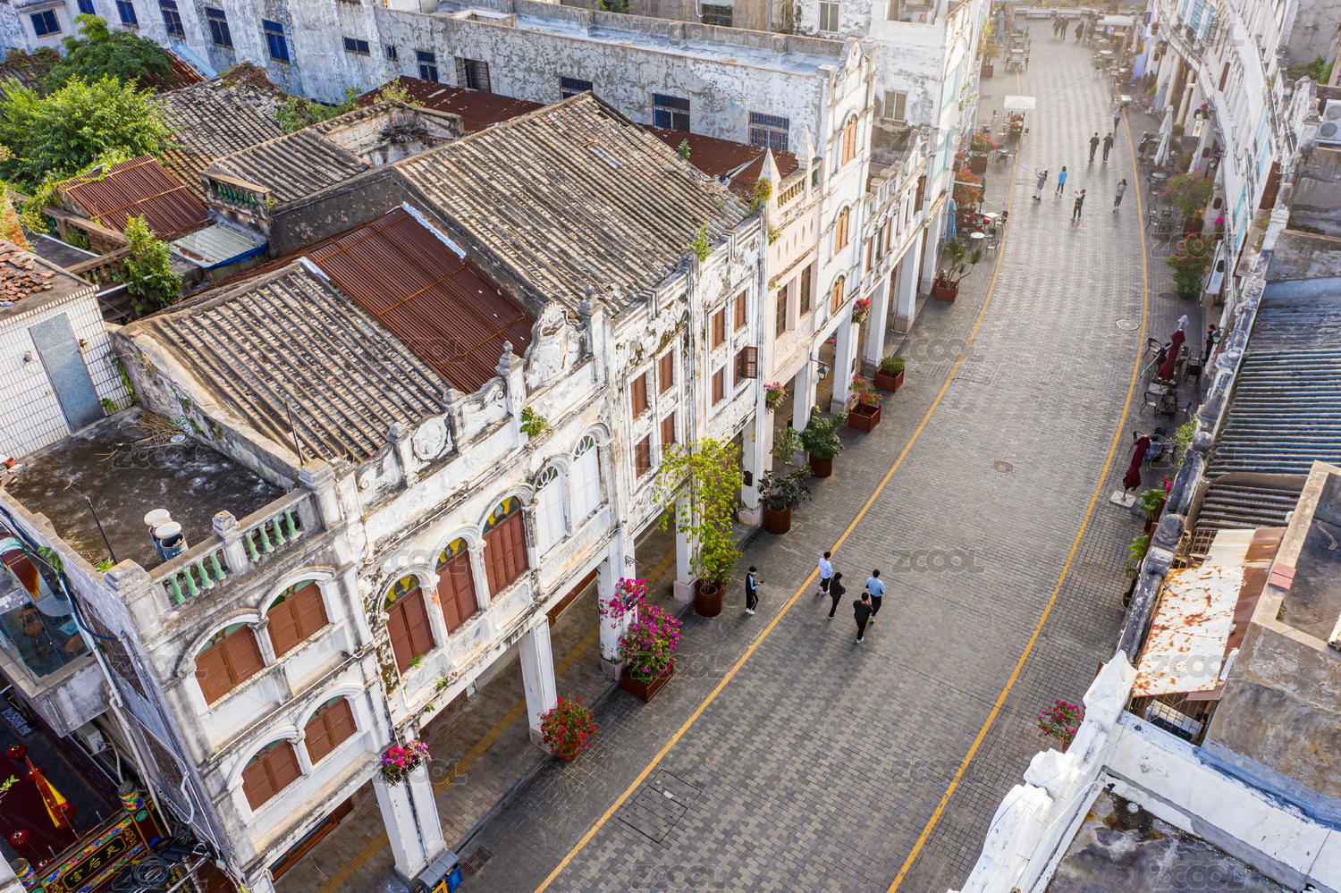 航拍海南海口騎樓老街街區(qū)歷史文化建筑群落