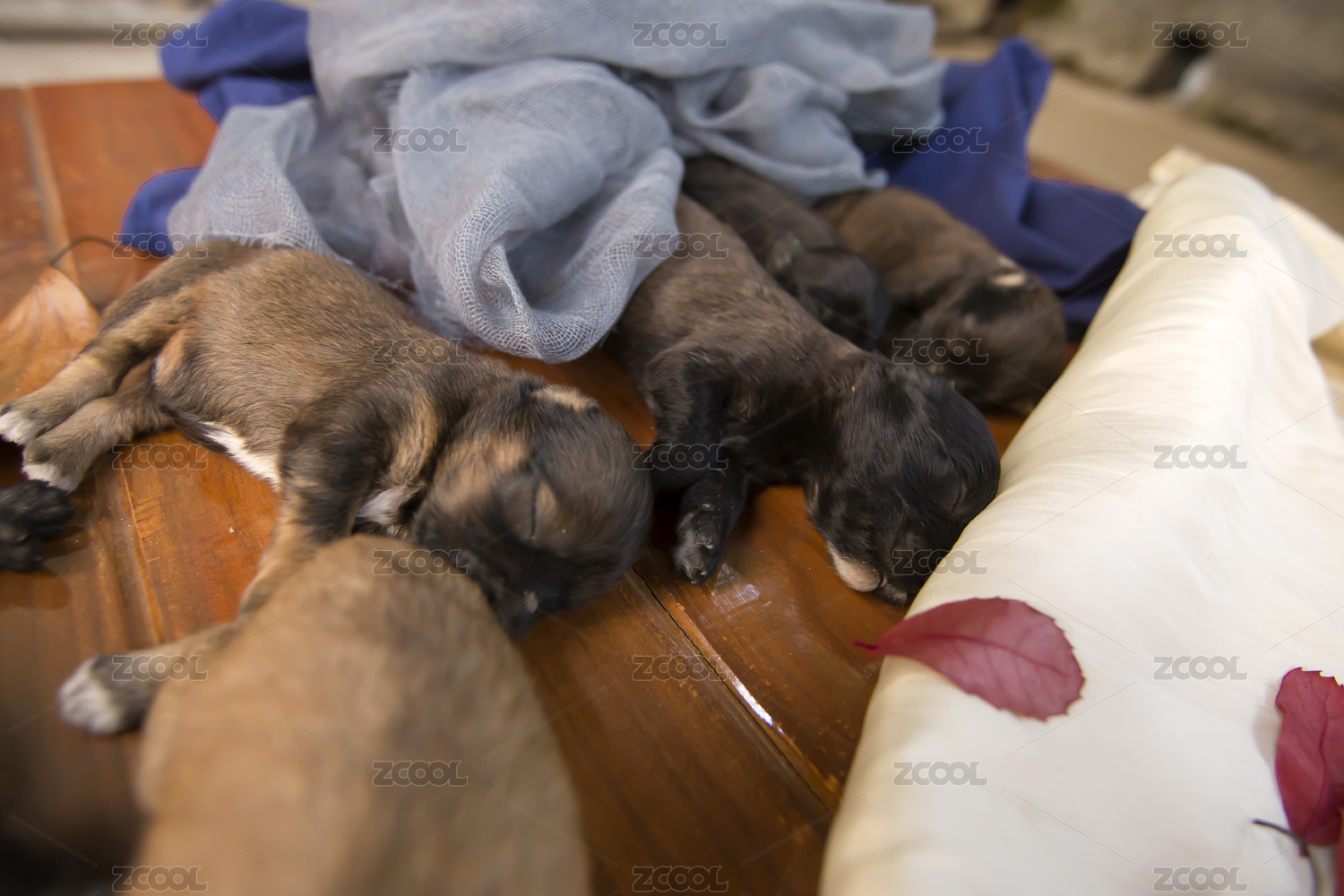 幾只新生的可愛寵物狗趴在木地板上睡懶覺特寫