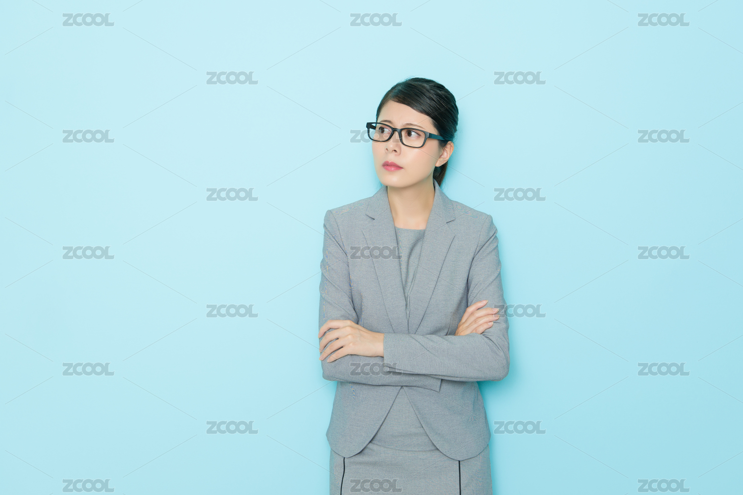 美職業(yè)經理人的女人得到在藍色背景辦公室輕松憤怒站立和思考公司的問題解決方案。