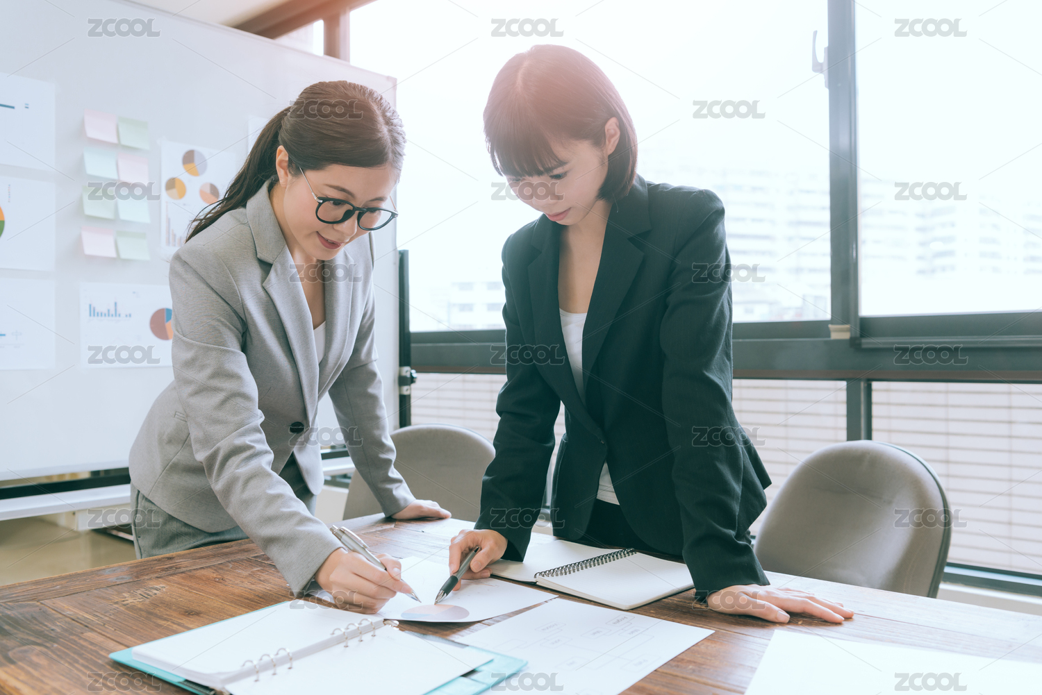 年輕優(yōu)雅的上班族伙伴一起開會,在會議桌思考公司的規(guī)劃,展望報告紙討論解決方案。
