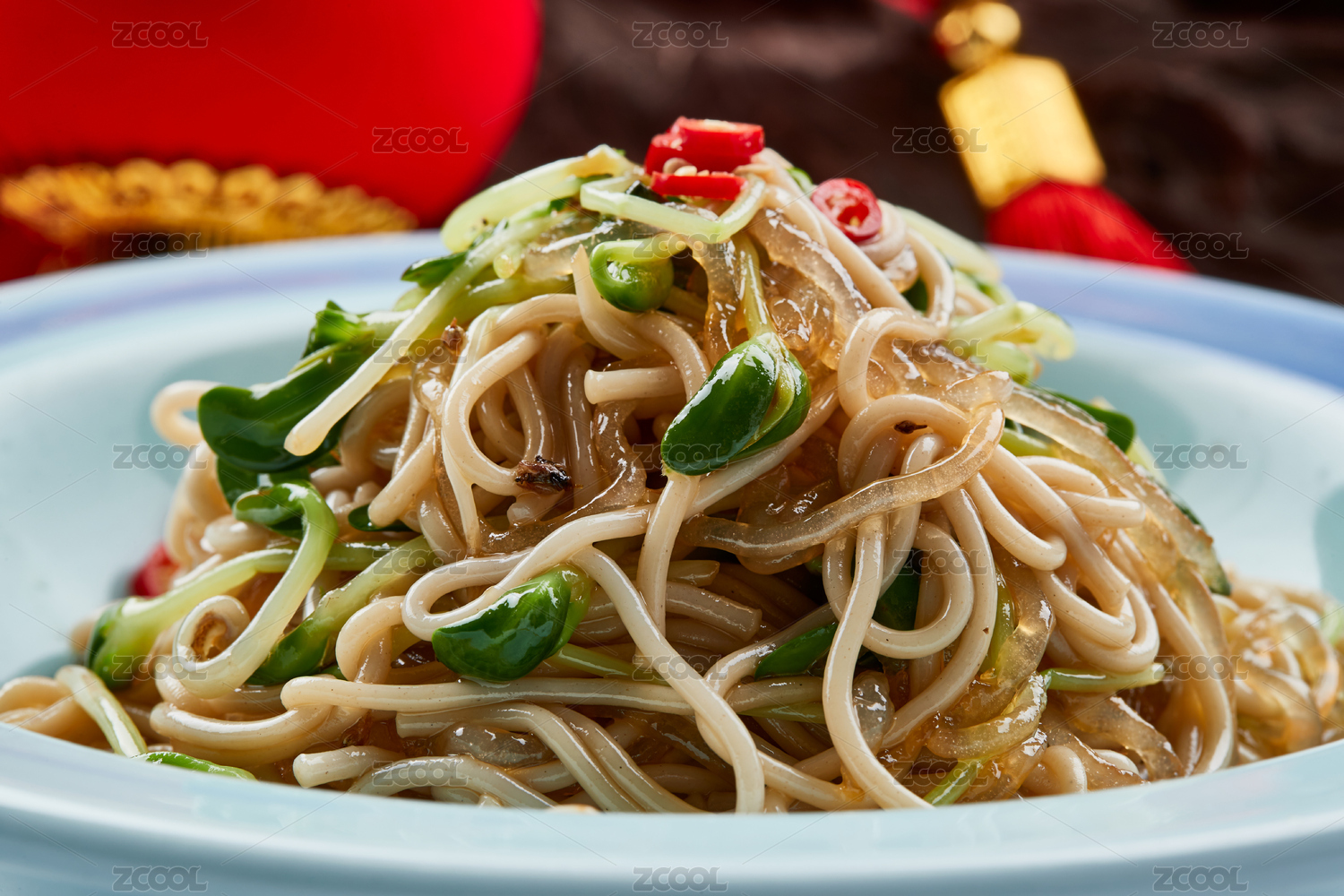 青色瓷餐具裝的黑豆苗涼拌莜面饸饹