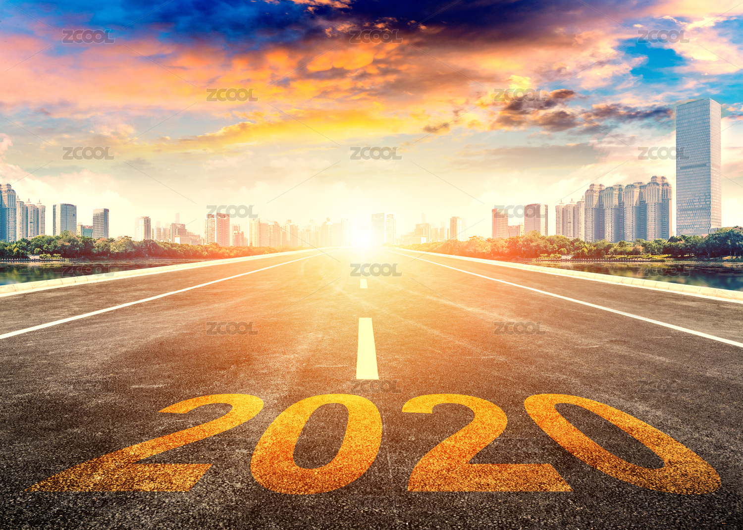 筆直前進通往現(xiàn)代城市的公路與新年2020概念。寫在現(xiàn)代都市上的2020數(shù)字。