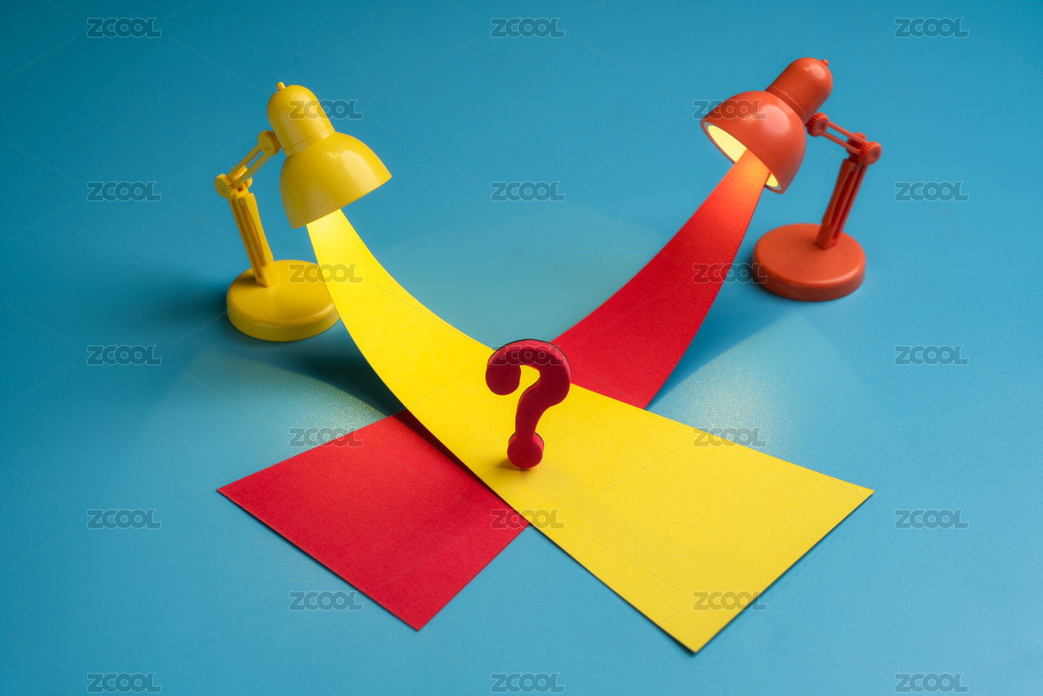 紅色的問號(hào)放在紅色兩色的臺(tái)燈射出的光交織