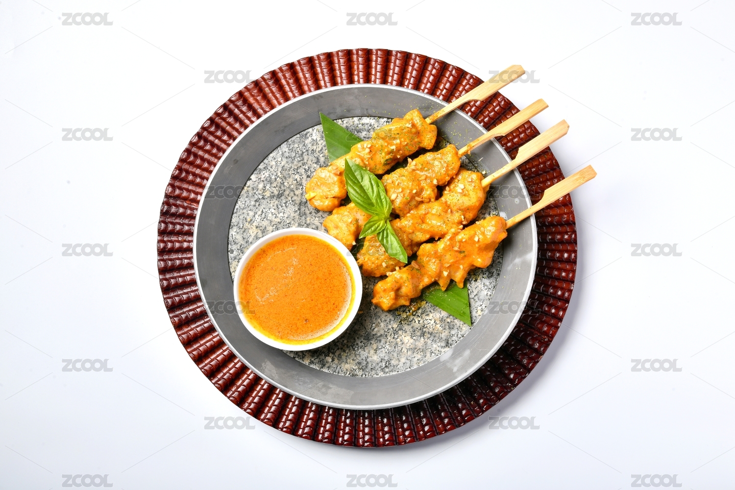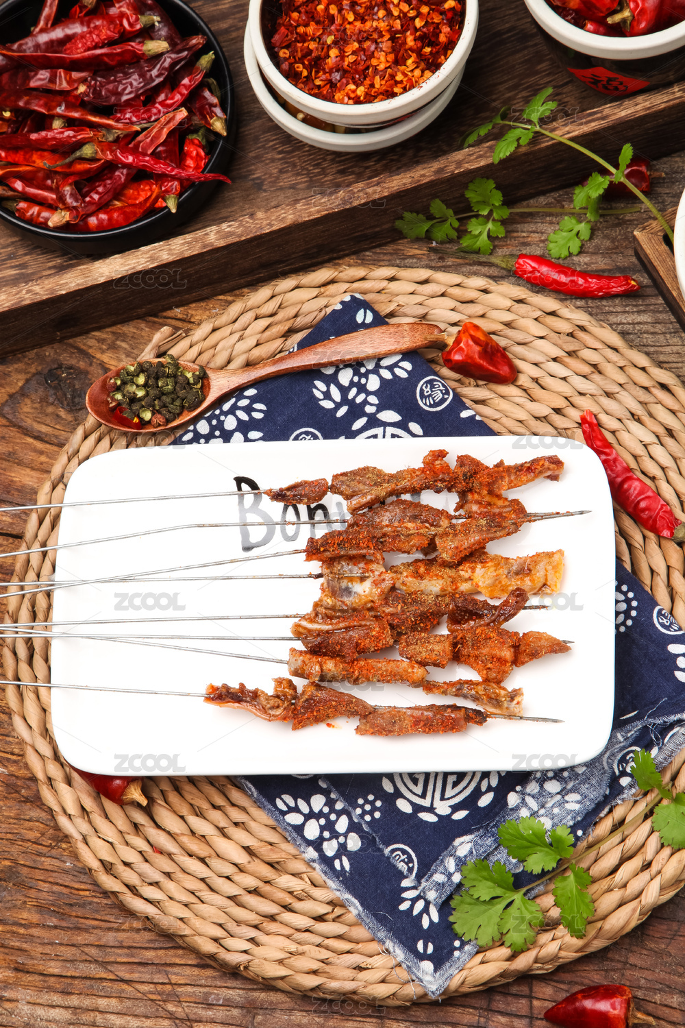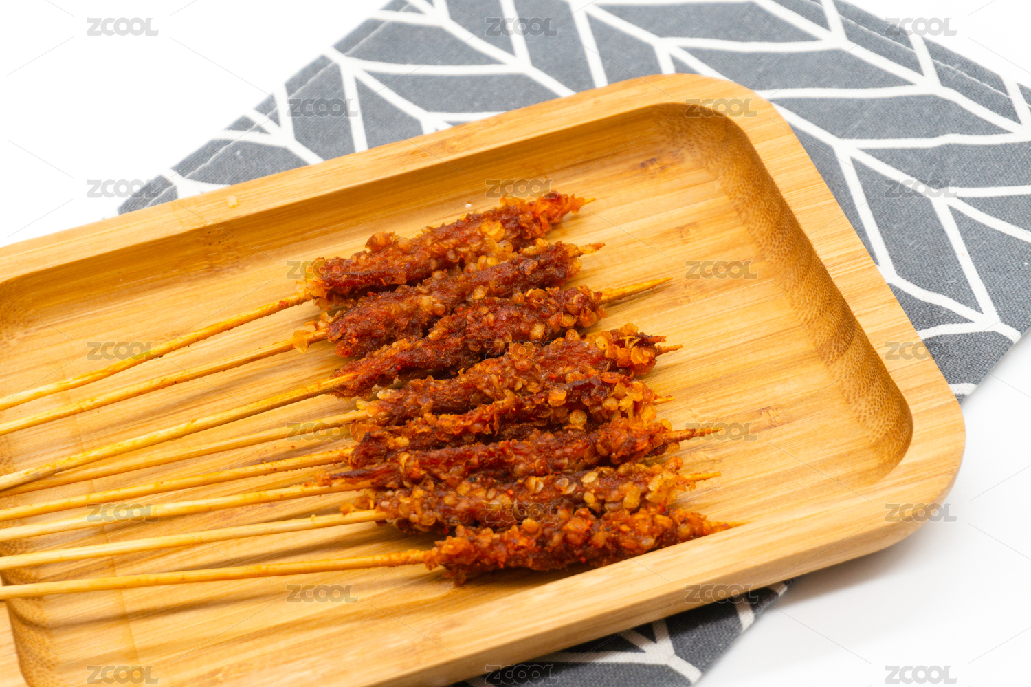 竹編墊上放著一盤(pán)烤肉串