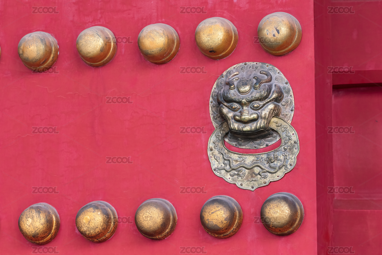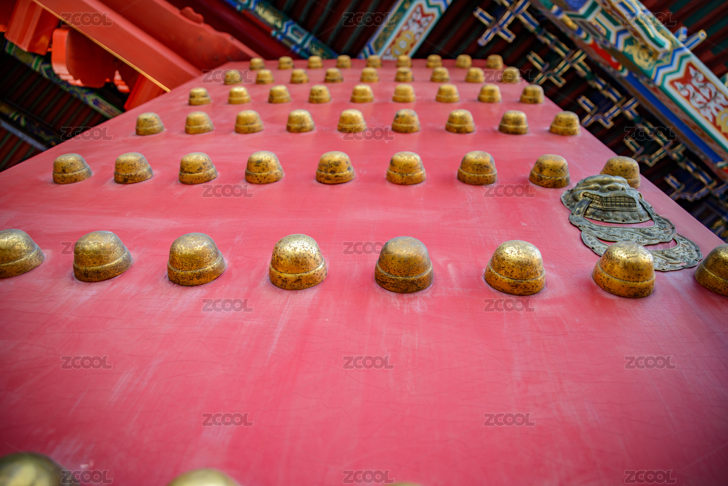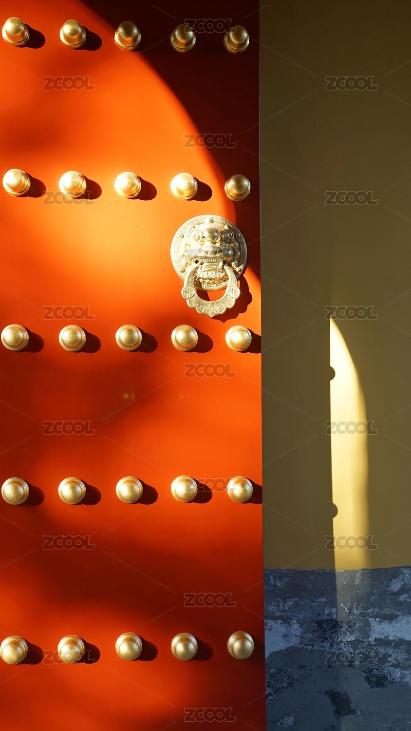 光影下的紅色宮門上鑲嵌著金黃色的門釘