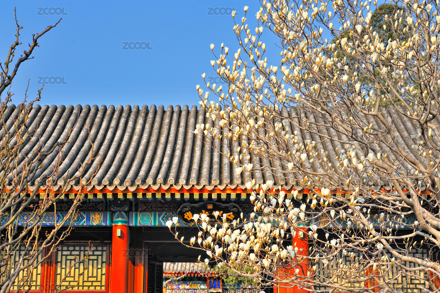 頤和園樂壽堂里的玉蘭花與長廊入口宮門