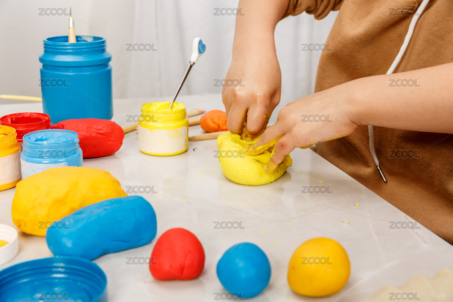 小朋友手工制作彩泥的桌面上