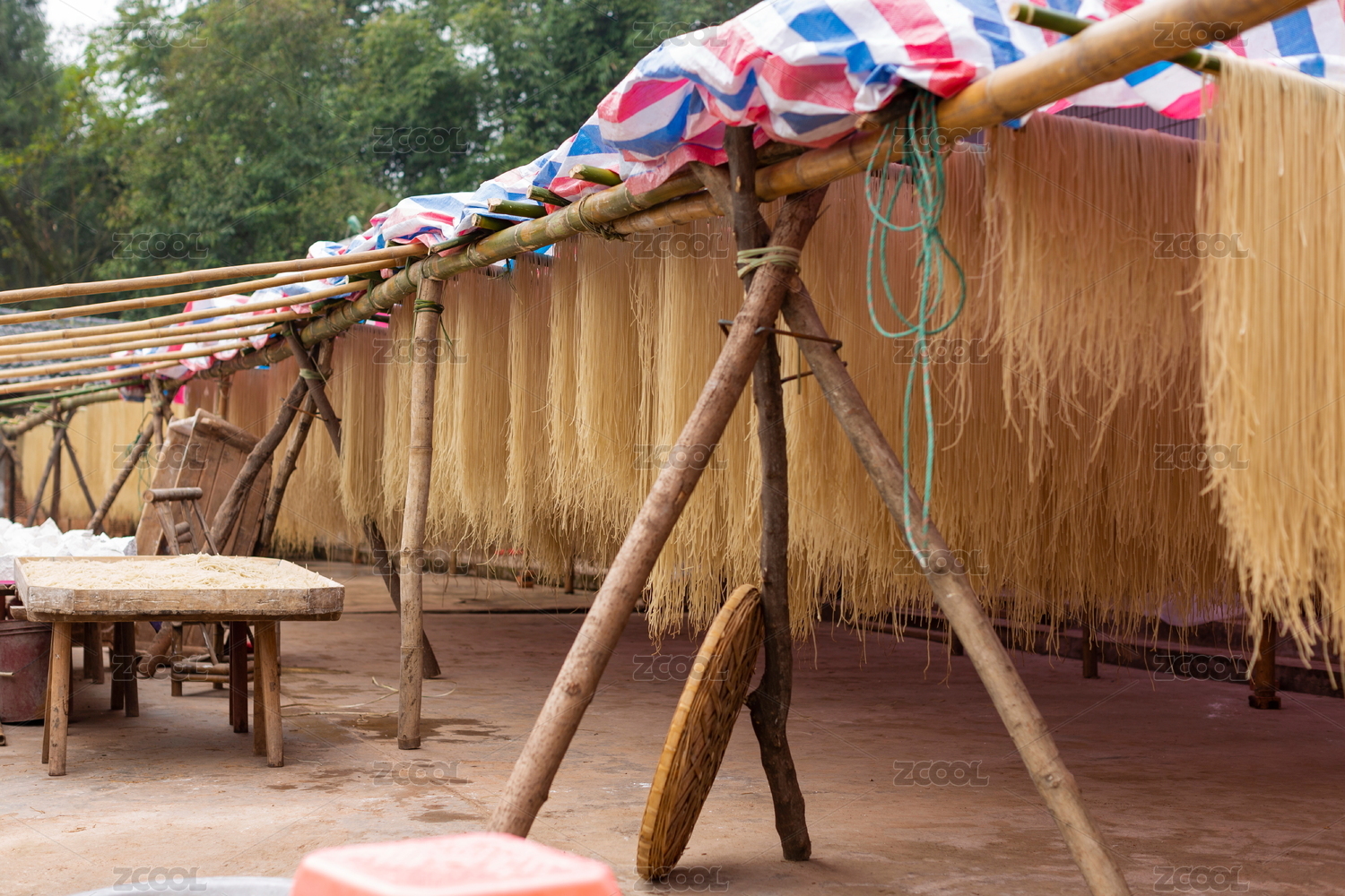 晾曬的手工制作紅薯粉條