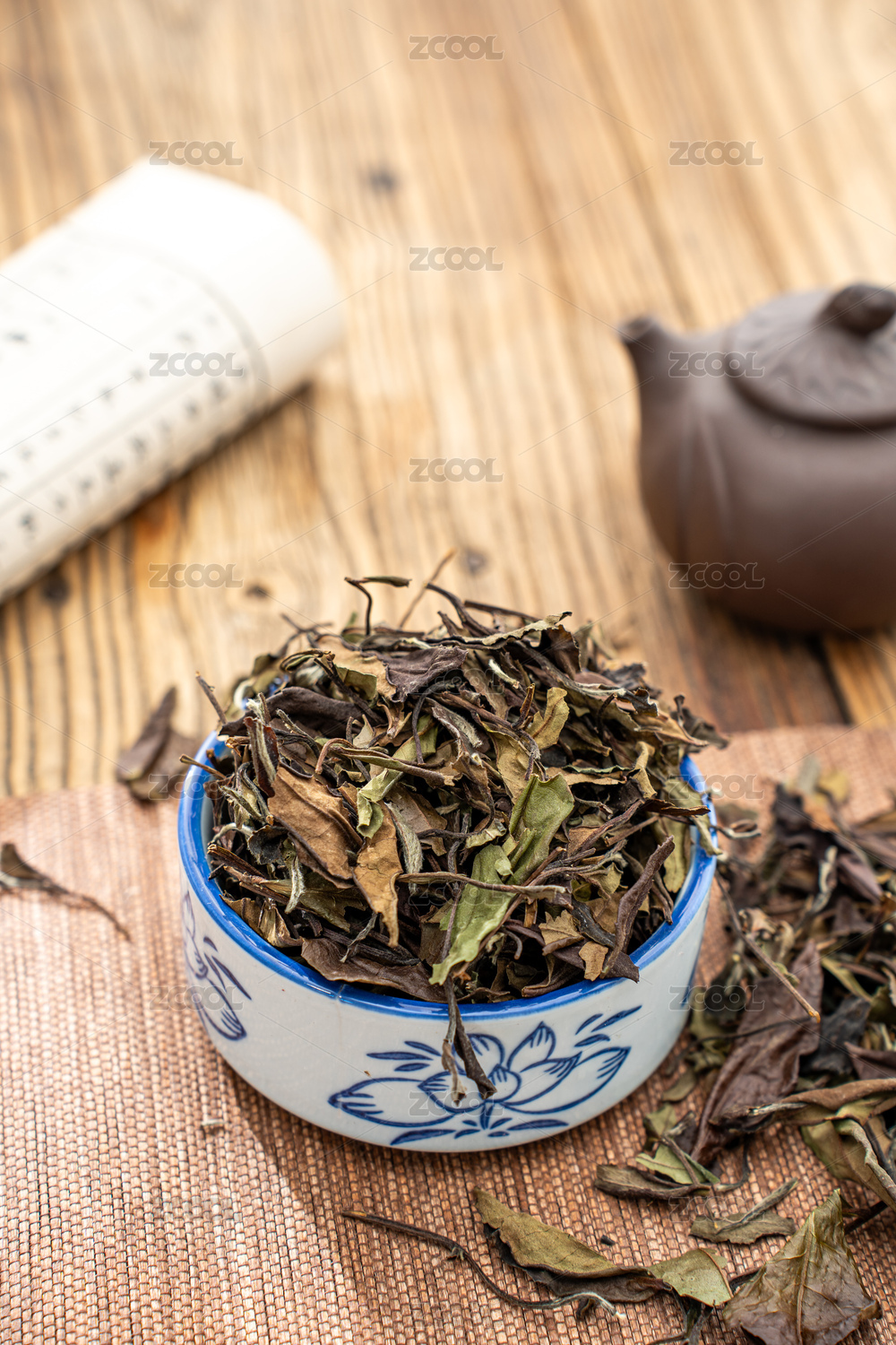 木紋桌面上放著的白茶白毫銀針和茶水
