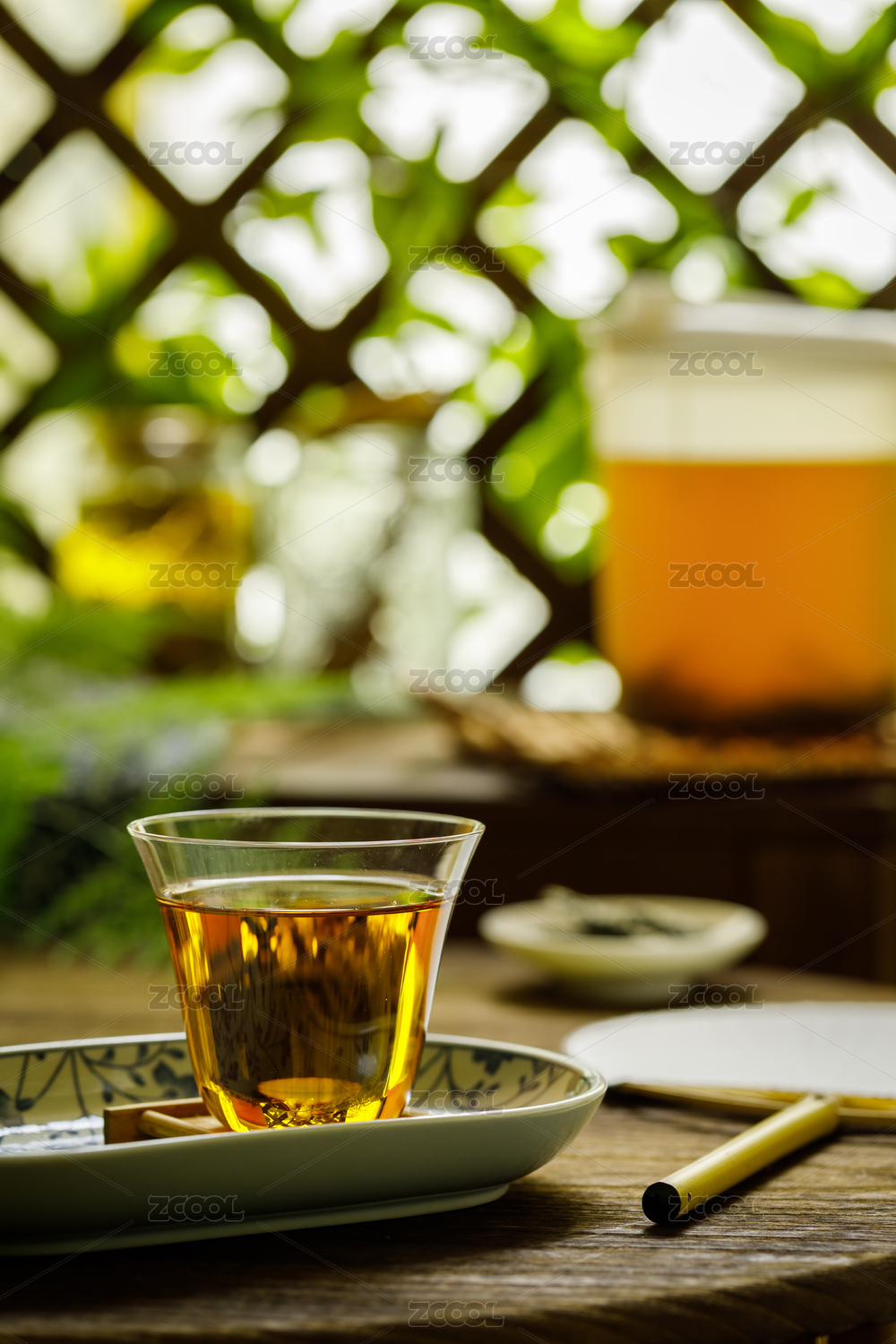 放在木桌上青花瓷盤里的一杯白茶茶湯