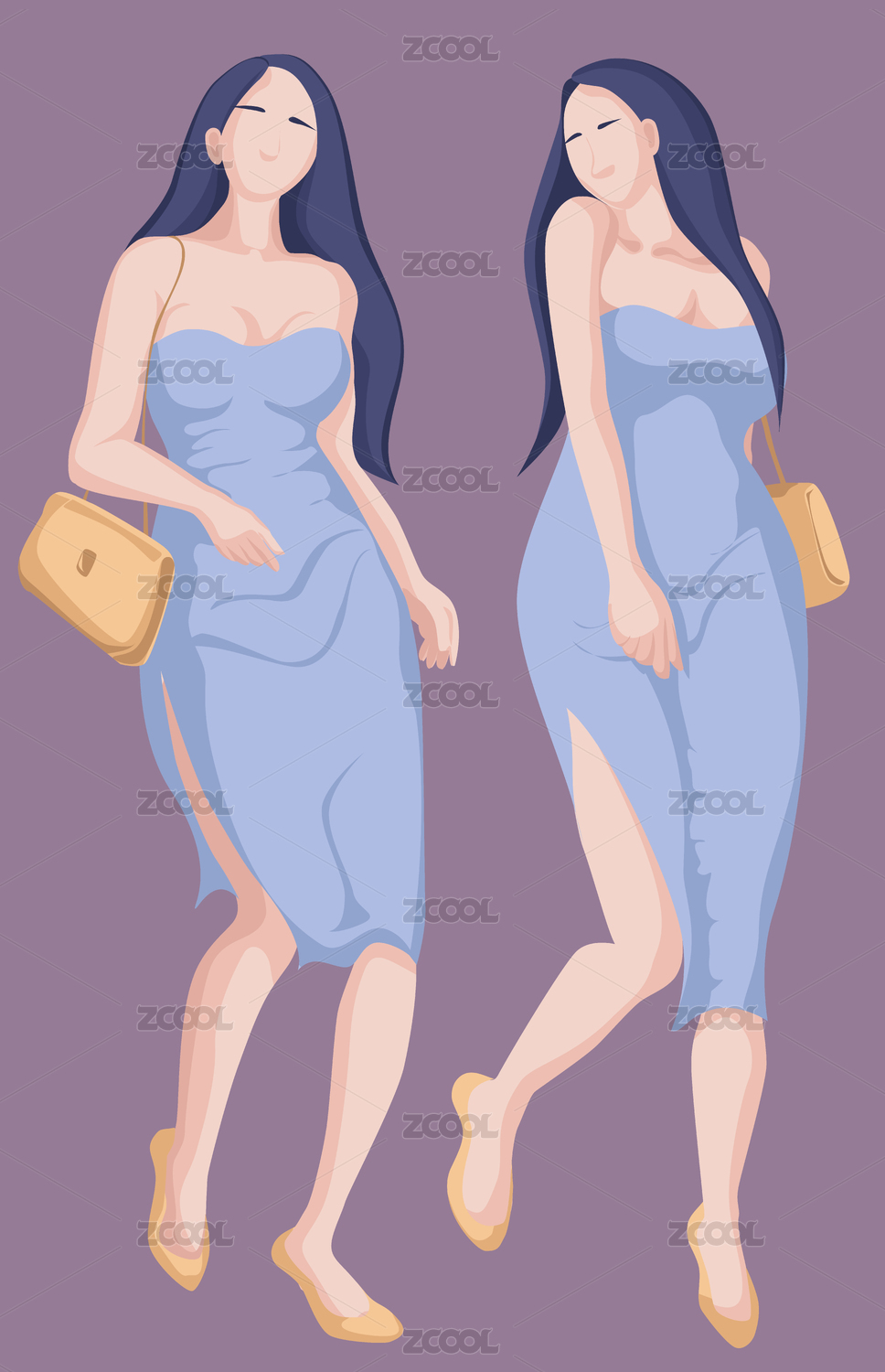 穿低胸連衣裙、挎女式包的美女走路動態(tài)插畫
