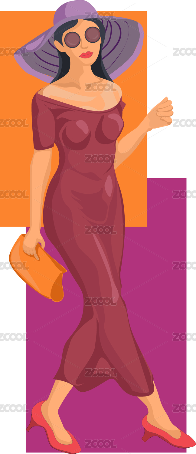 穿緊身連衣裙戴遮陽帽的美女走路姿態(tài)卡通畫