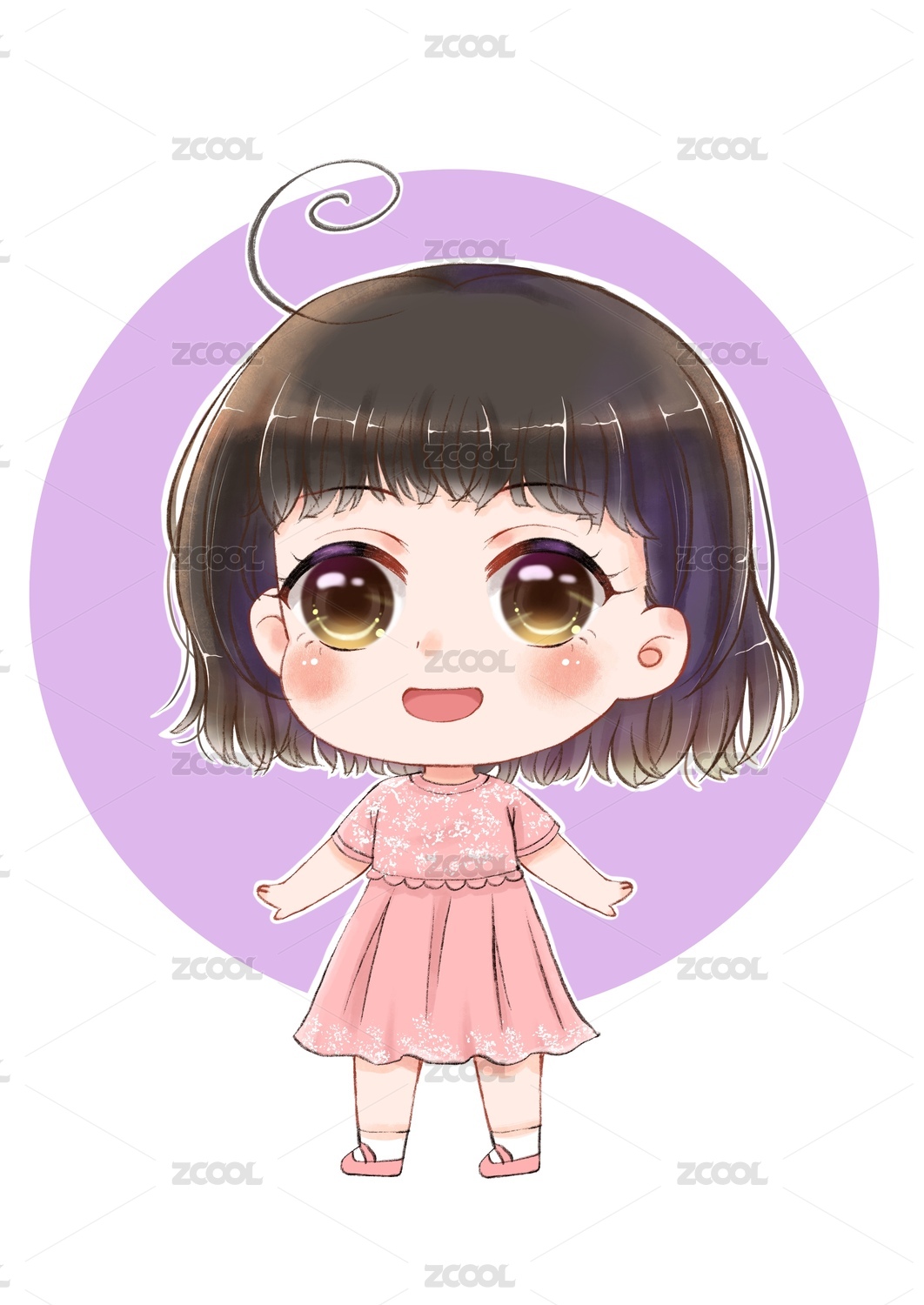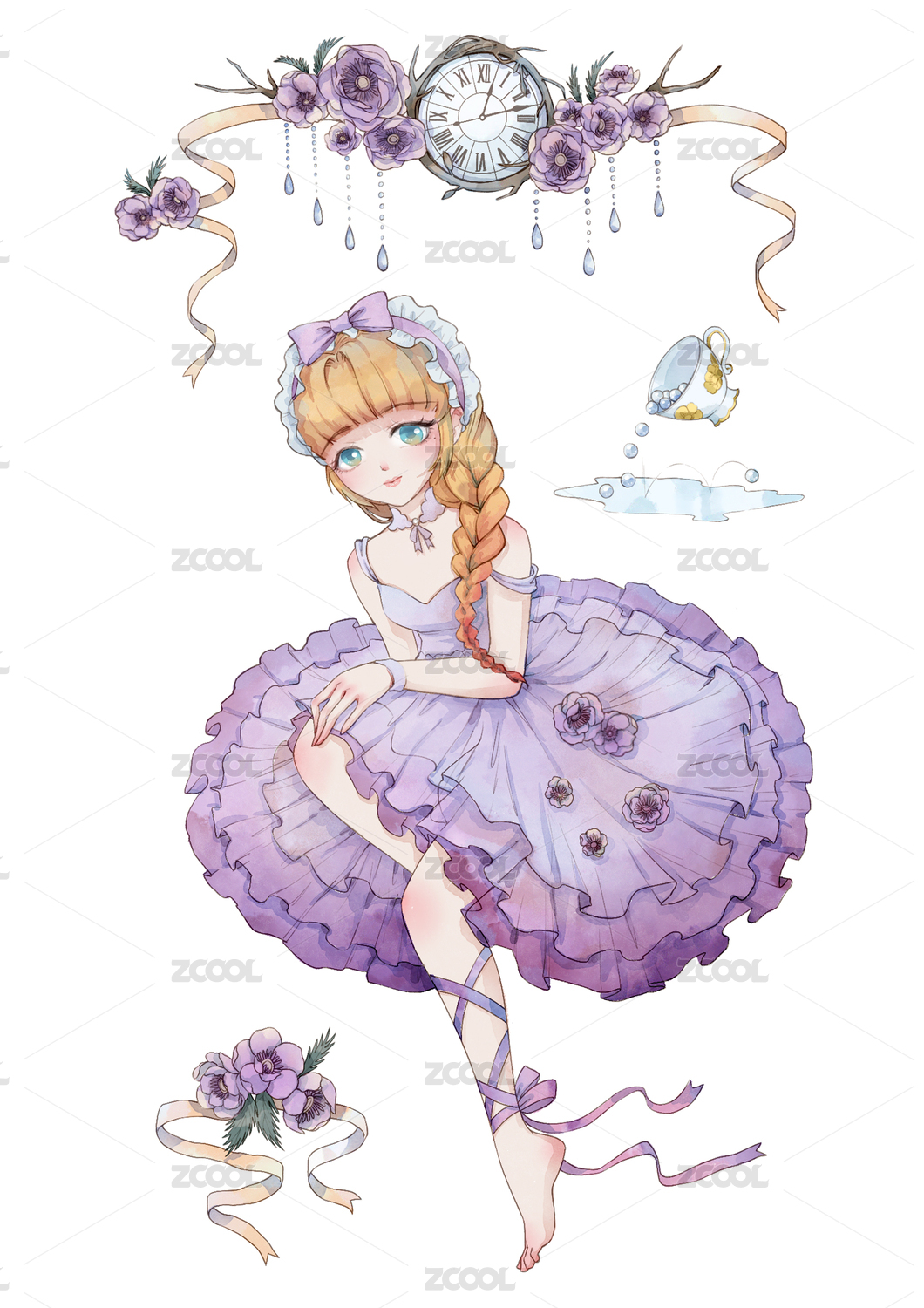 二次元穿紫色連衣裙的女孩插畫