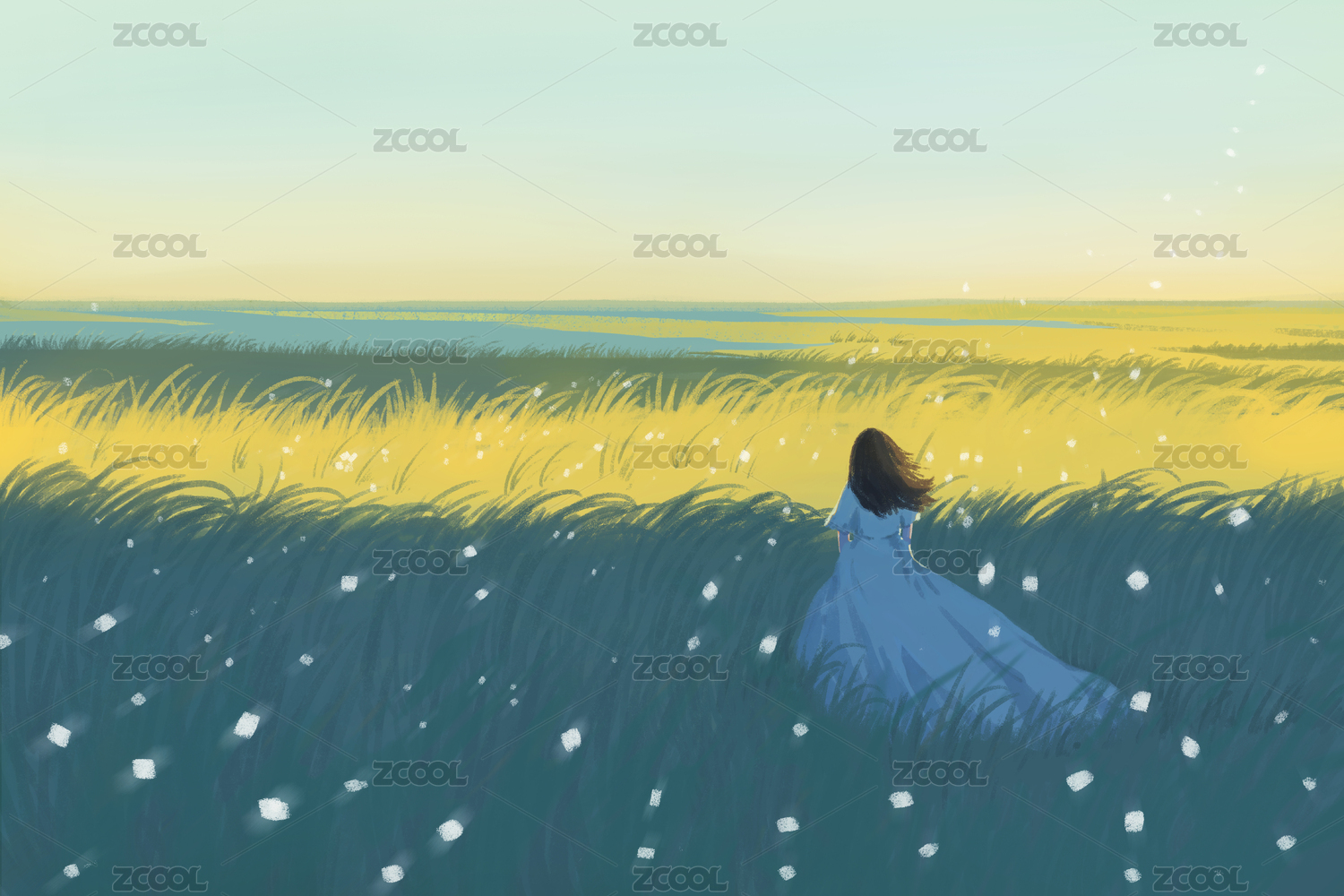 藍(lán)天綠草白色連衣裙女孩