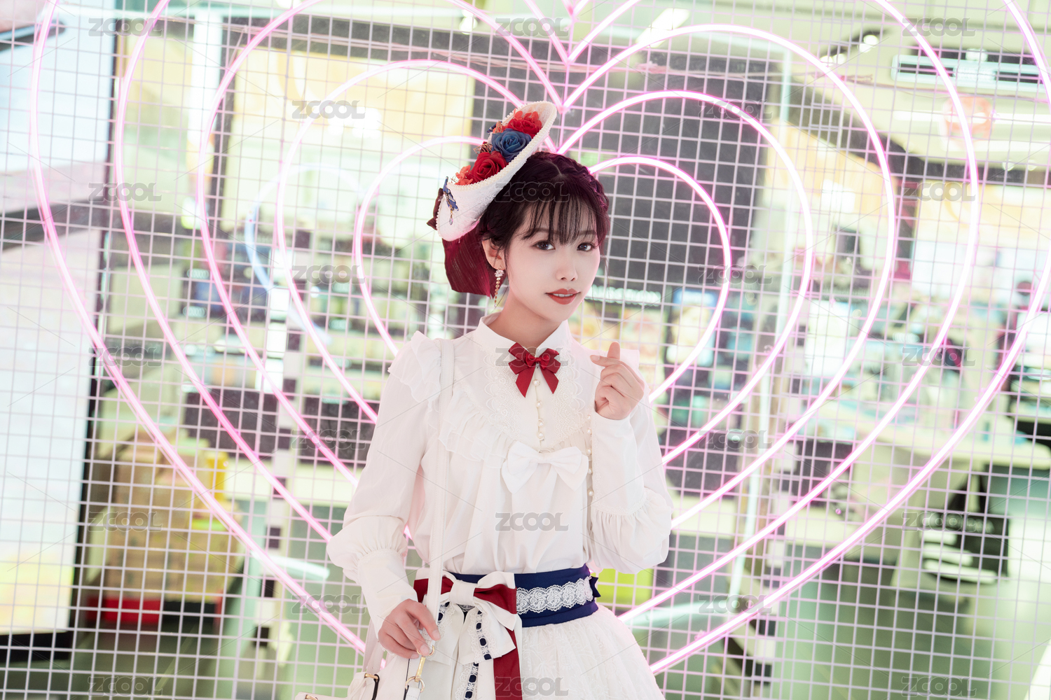 白色連衣裙的少女在心形霓虹燈前微笑