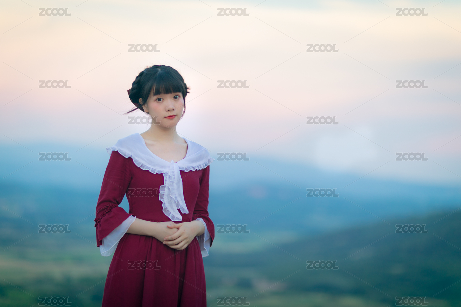 山間公園里穿著紅色復(fù)古連衣裙的亞洲女性