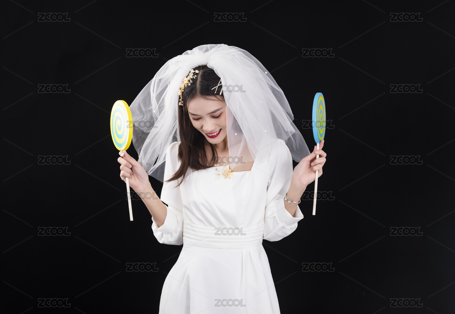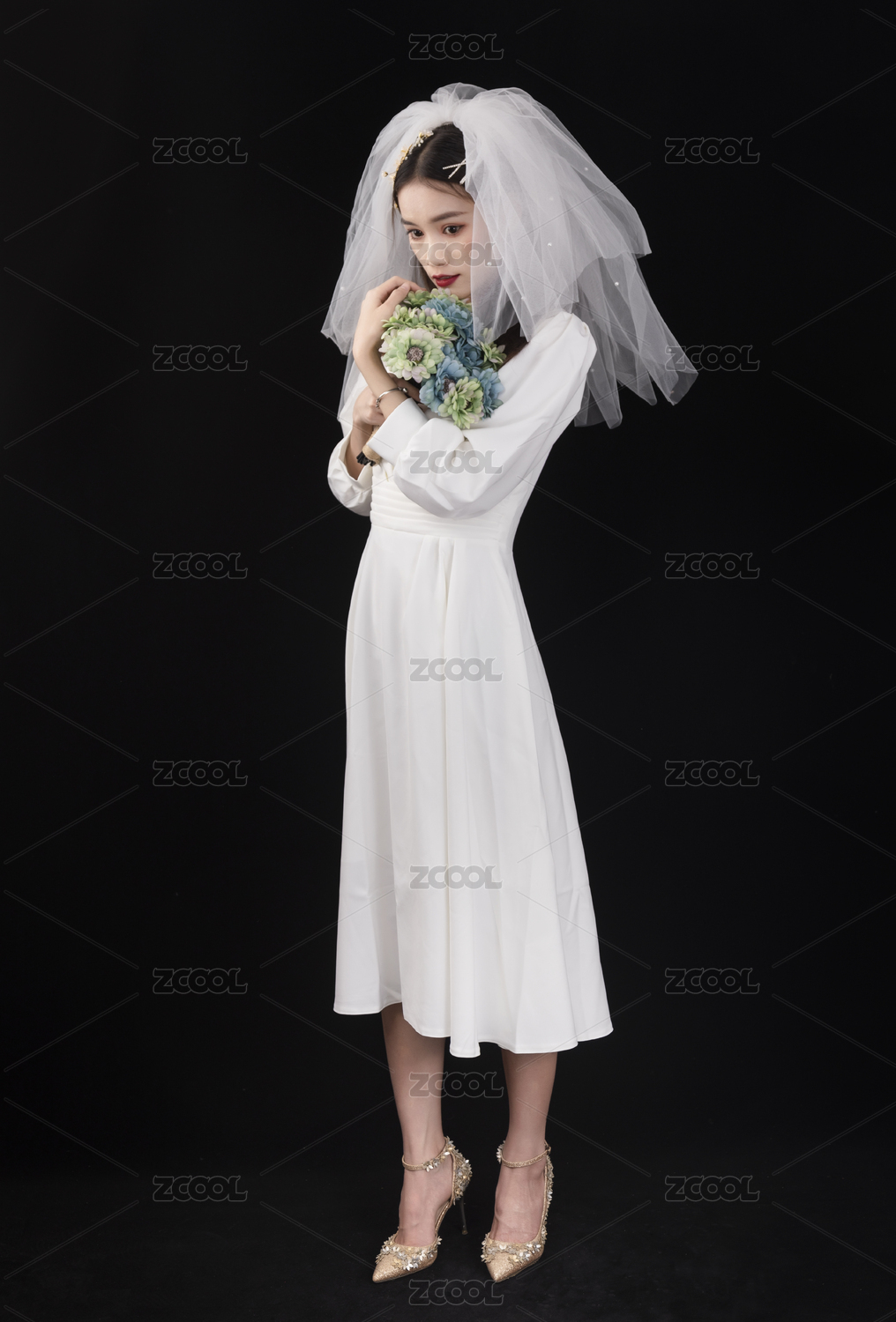 穿著白色連衣裙戴著頭紗的年輕女性